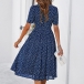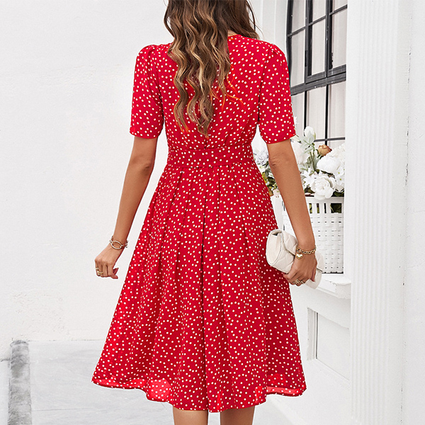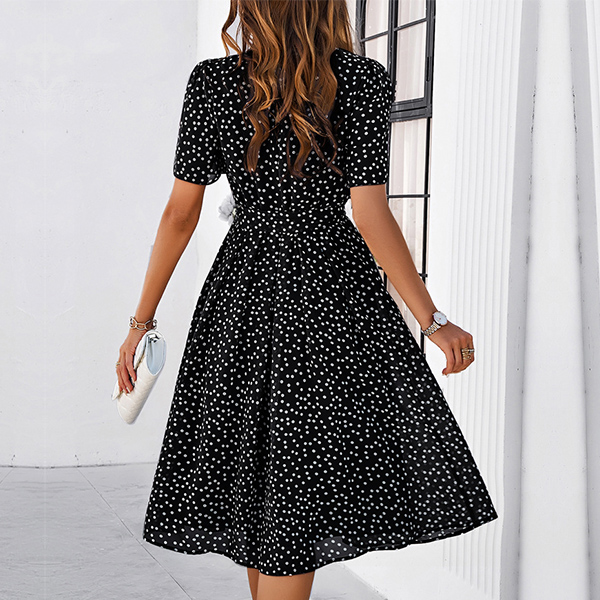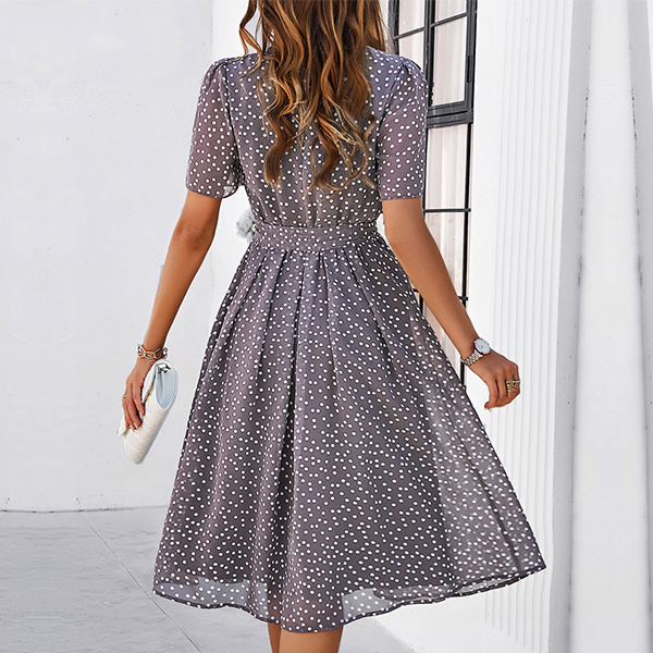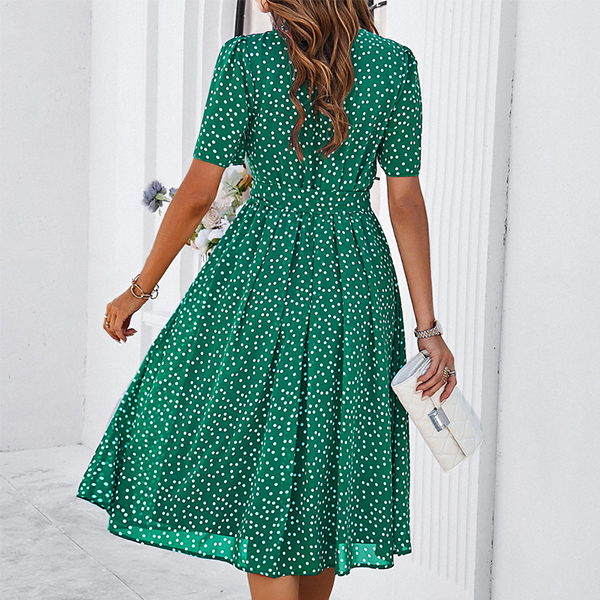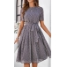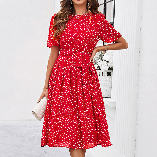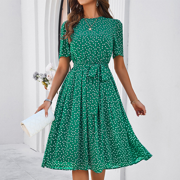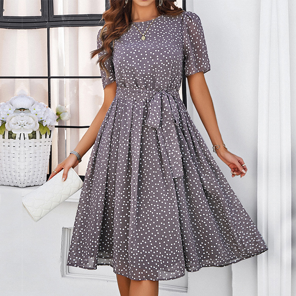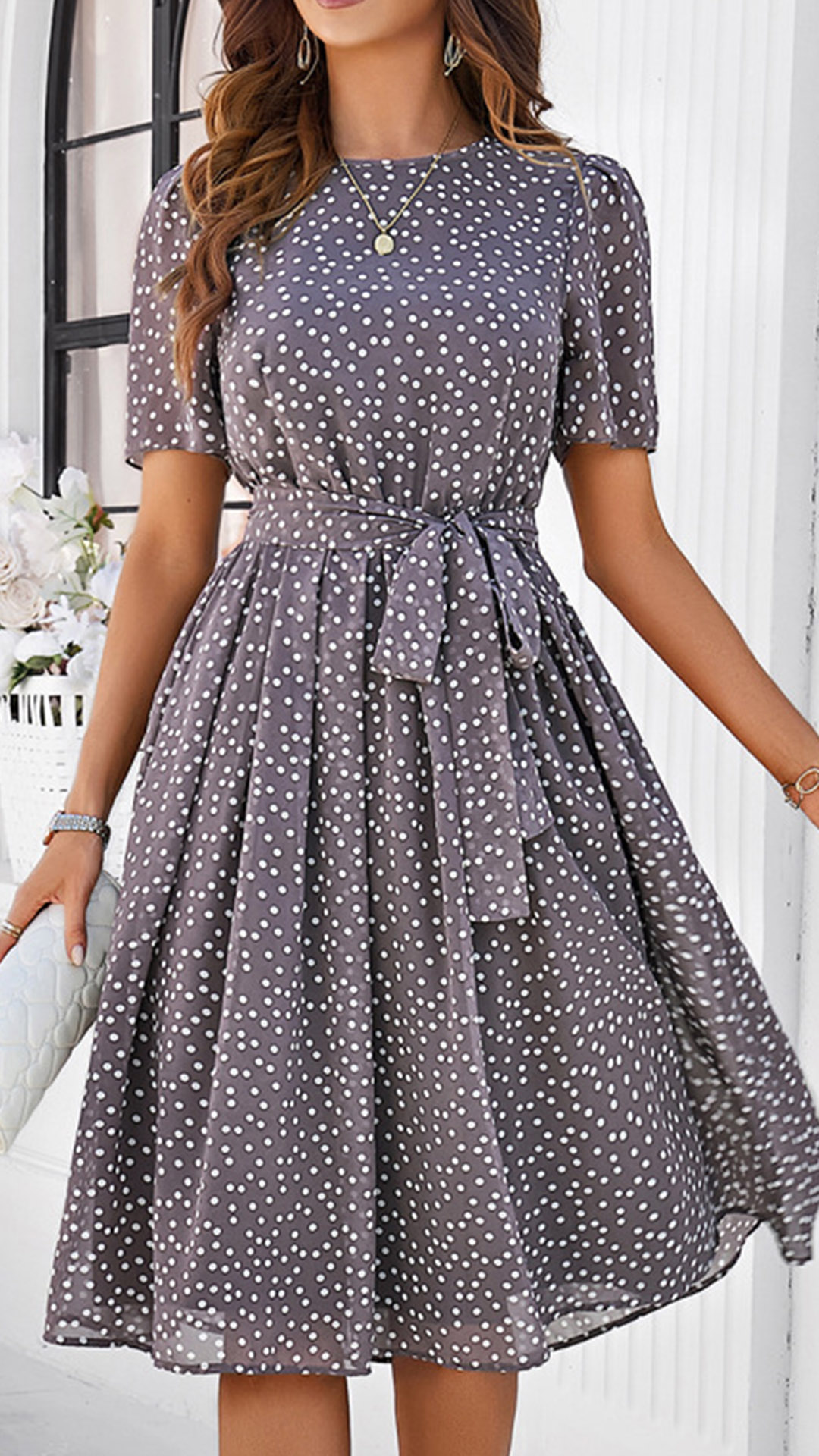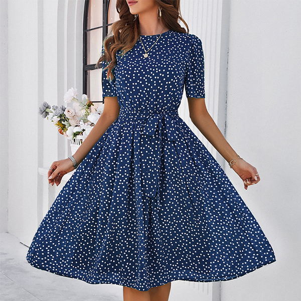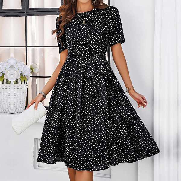 Fashion Dot Printed Crew Neck Short Sleeve Self-tie Dress