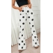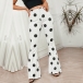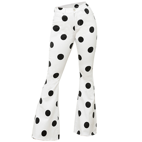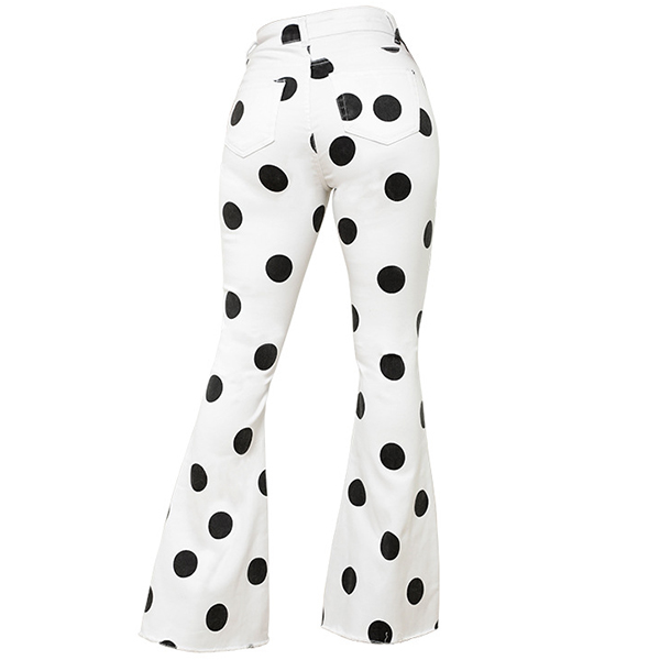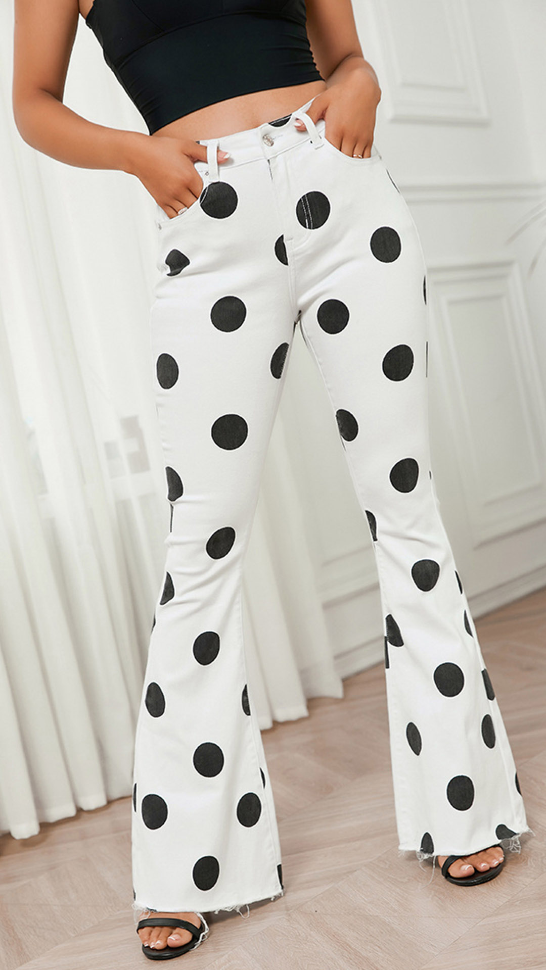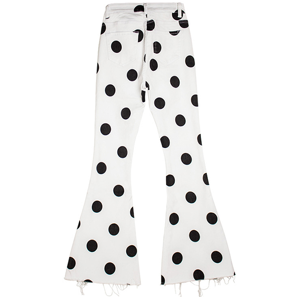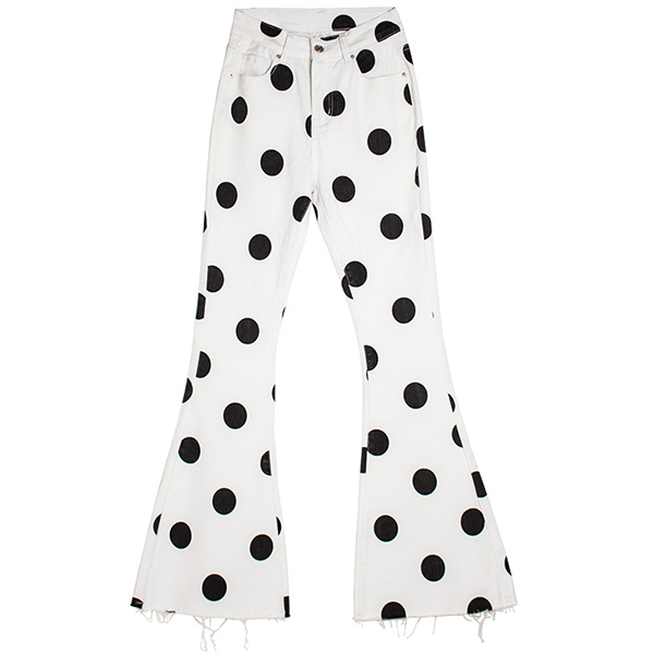 Look at this denim pants! The dot print adds a fun and whimsical touch to the jeans, creating a unique and eye-catching design.While the wide-leg silhouette adds a fashion-forward and on-trend element to the jeans. It combines a classic denim silhouette with a playful and feminine twist.