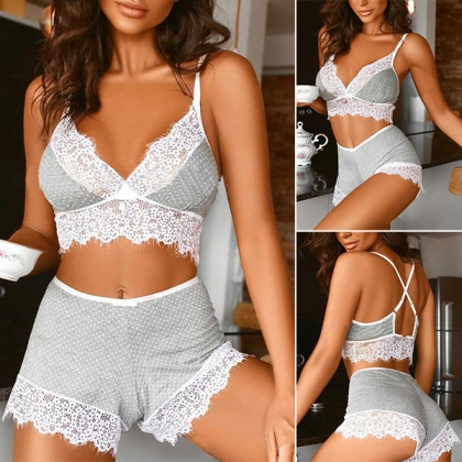 Fashion Dot Printed Lace Spliced Two-piece Lingerie Set