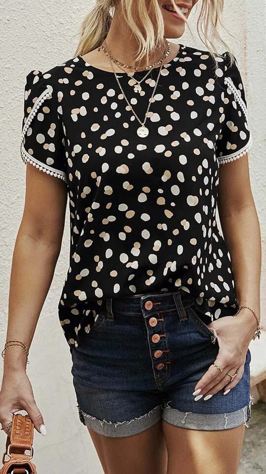 For a casual summer look, we could try this shirt. Features dot print and lace spliced short sleeve design, this womderful poece not only can give you the comfy, but also can offer you different matching styles.
