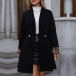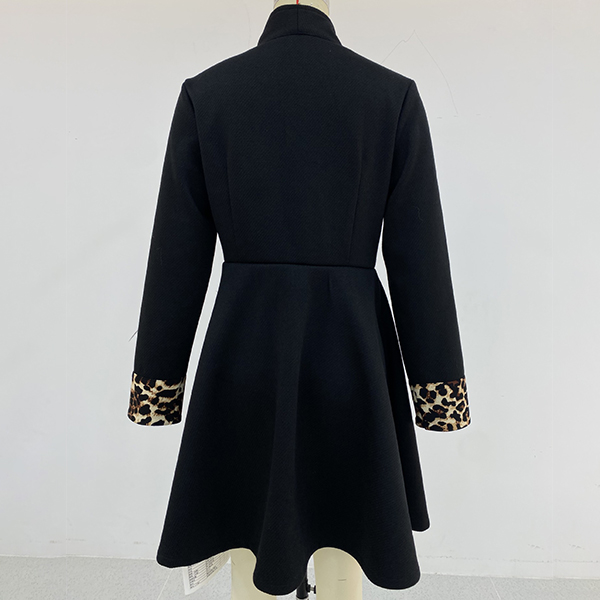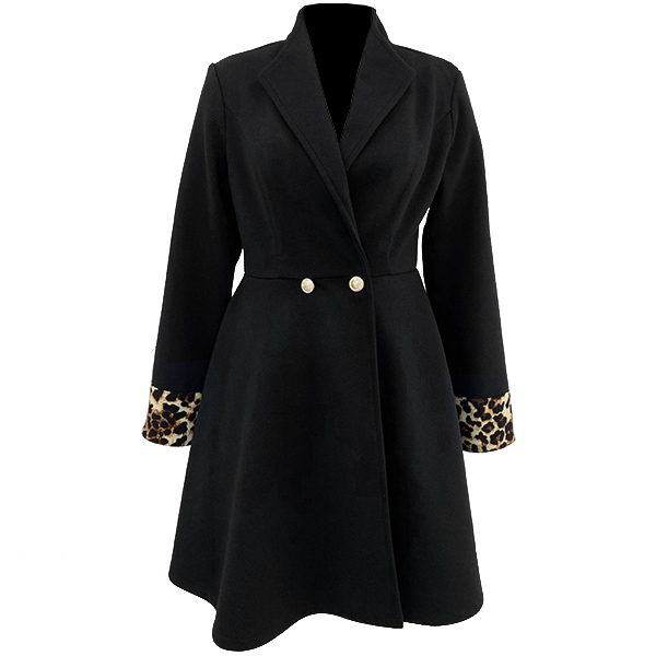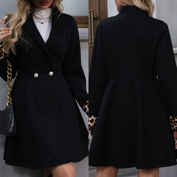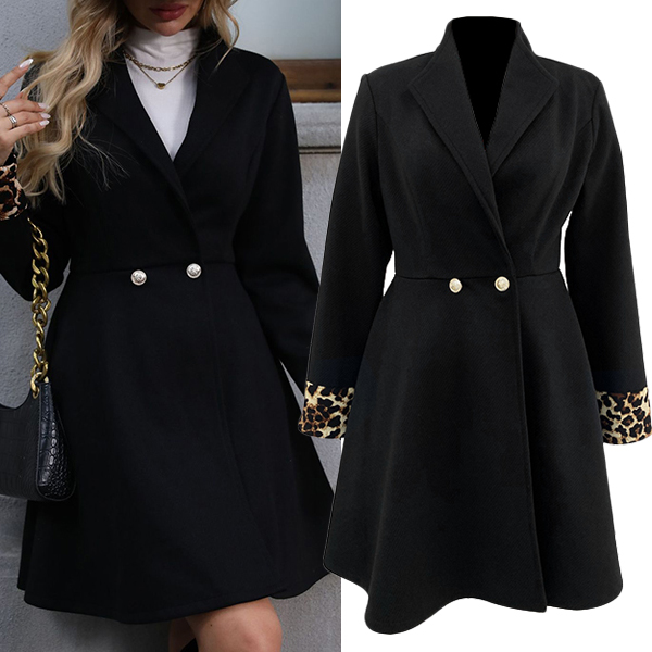 This black jacket features a double-breasted design, lapel collar, long sleeves, and leopard print cuffs, creating a stylish and bold look. Perfect for this season.