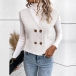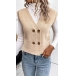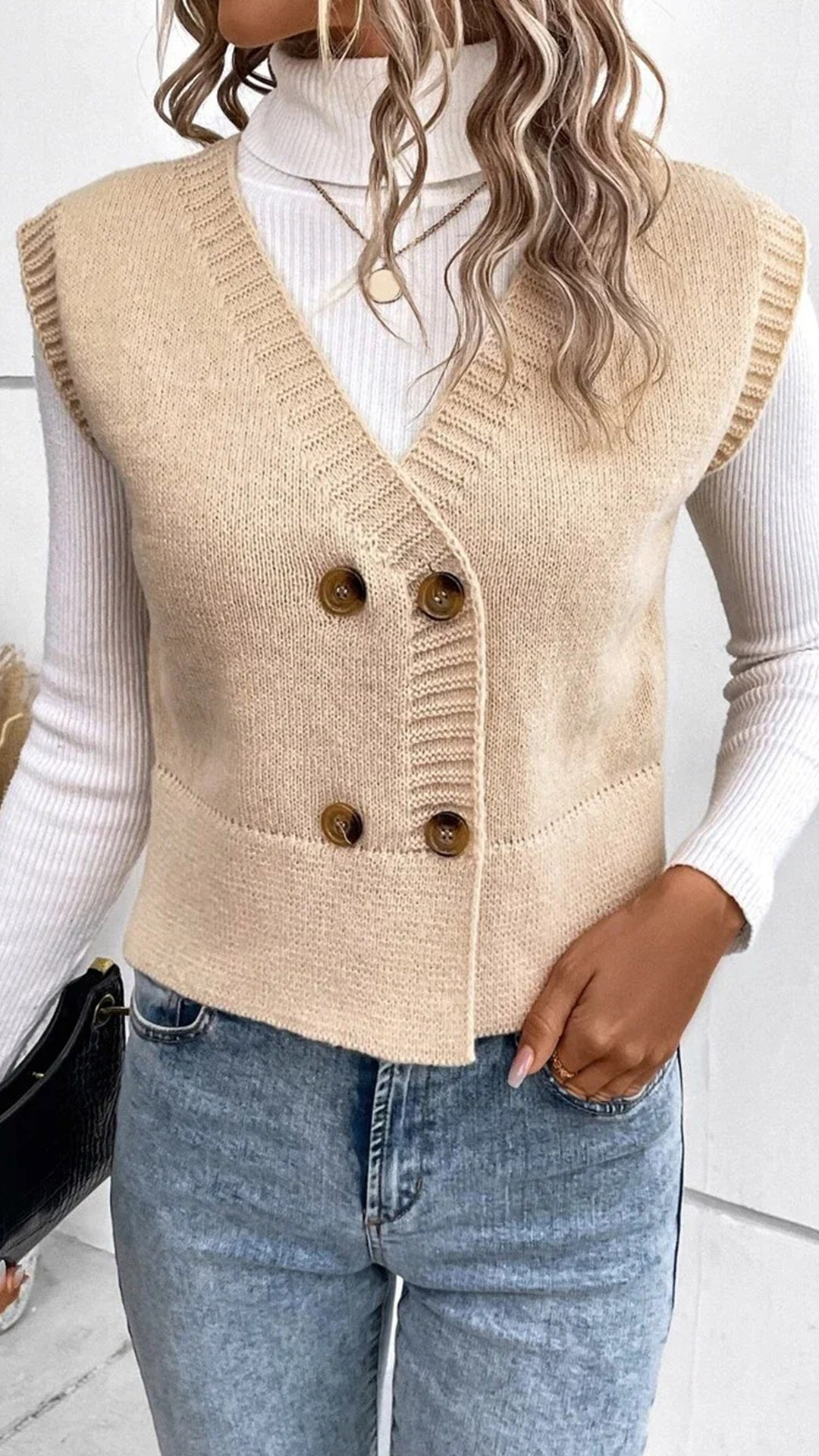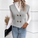 Look at this sleeveless cardigan! The double-breasted design gives it a structured and polished look, while the V-neckline adds a feminine and flattering touch. Crafted from high-quality knitted fabric, this cardigan is designed to be comfortable, cozy, and versatile. Pair it with a blouse and trousers for a sophisticated and office-appropriate look, or wear it over a dress for a more casual and relaxed ensemble.