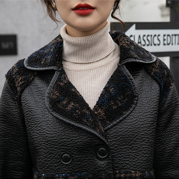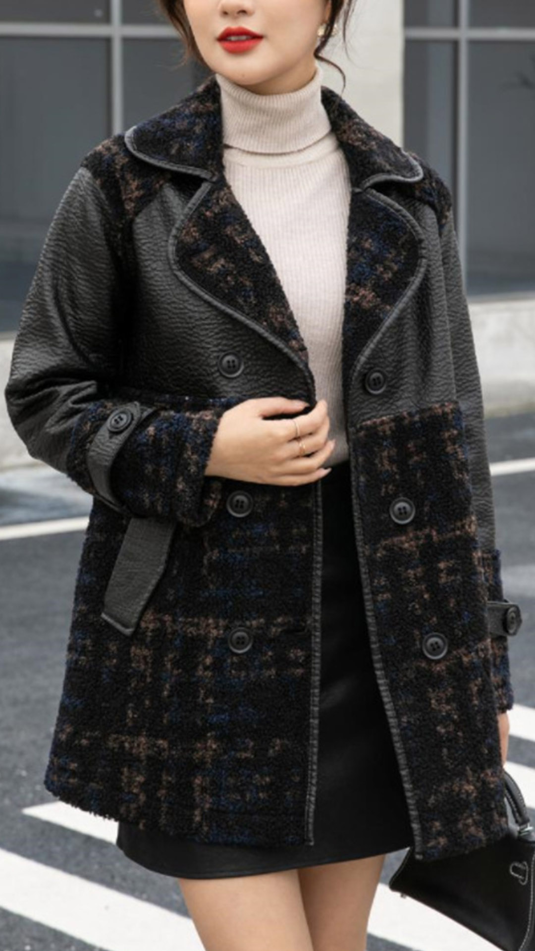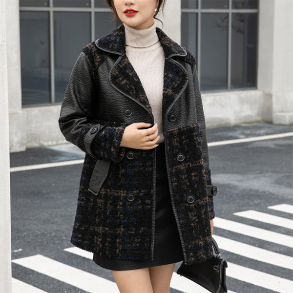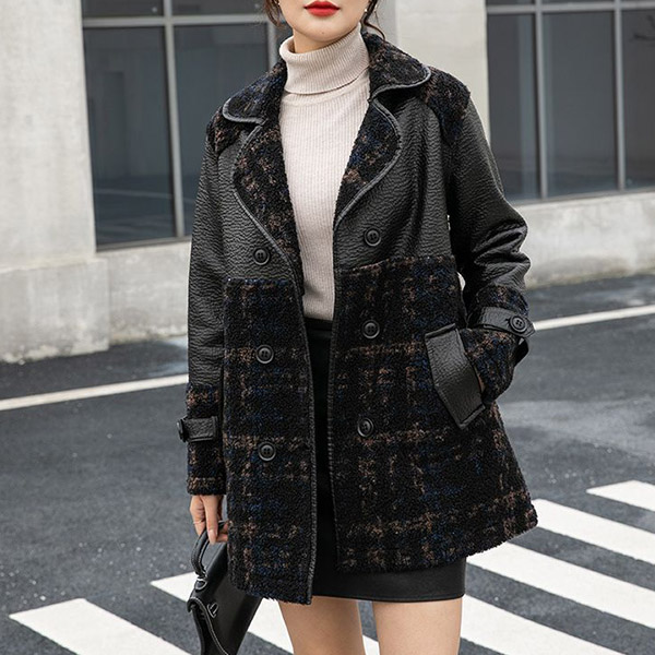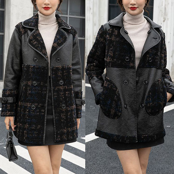 Fashion Double Breasted Woolen Checkered Spliced Artificial Leather Reversible Coat
