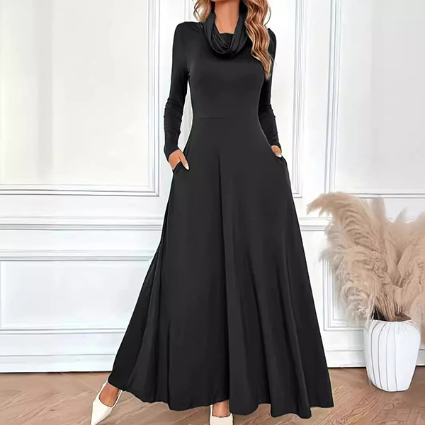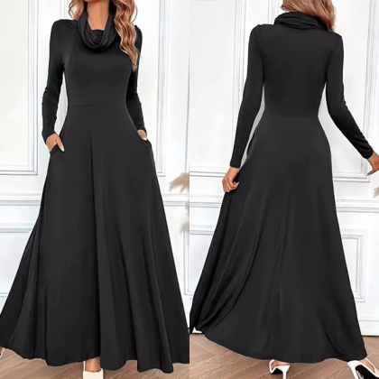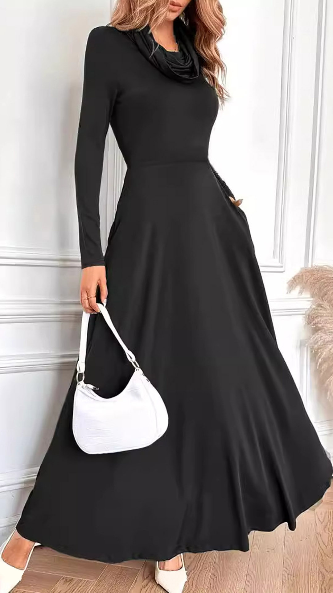Elevate your style with this black Maxi Dress. This elegant dress features a drape neck design that adds a touch of sophistication and glamour to your look. The maxi length adds drama and elegance, creating a statement silhouette that is both chic and timeless. Whether you wear it to a formal event or a special occasion, this dress is sure to make you feel like a fashion icon.