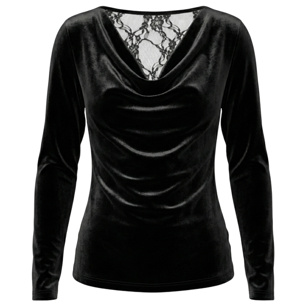 This luxurious shirt features elegant draped neck styling with romantic back lace-spliced with draped effect detailing and sumptuous velvet construction for contemporary sophisticated elegance. Wanna have a try?