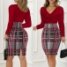 Featuring a draped neck and long sleeves, this dress exudes a modern and elegant vibe. The plaid printed on the skirt add some chic element to this dress! The length of the dress is typically knee-length or slightly above, making it suitable for various occasions.