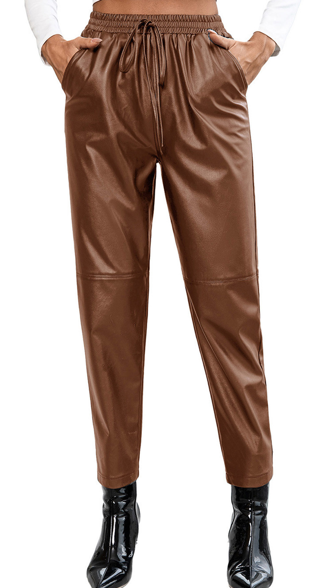 Fashion Drawstring Elastic Waist Artificial Leather PU Pants