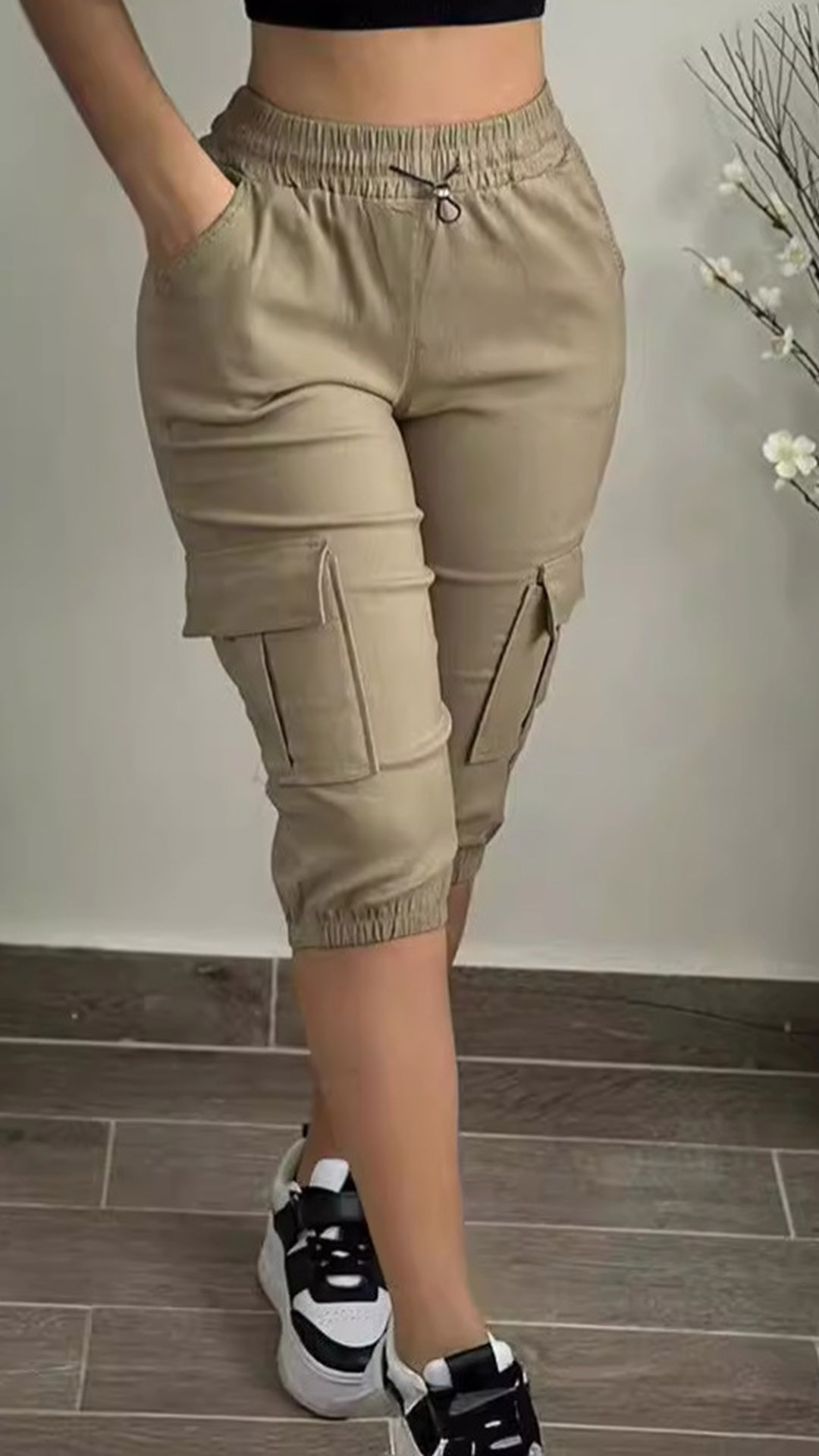 Fashion Drawstring Elastic Waist Side Patch Pockets Shorts for Women