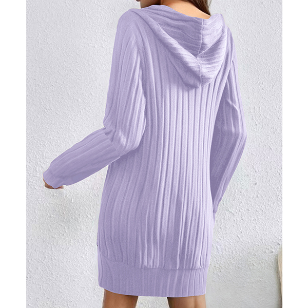 This comfortable dress features practical hooded design with adjustable drawstring and convenient kangaroo pockets for contemporary casual sophistication. Multi-colors available.