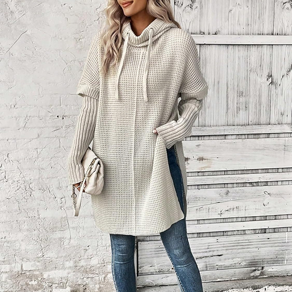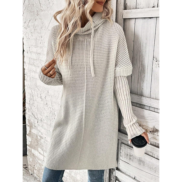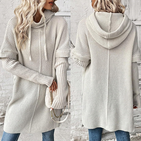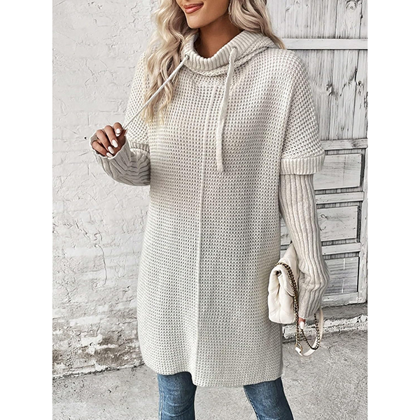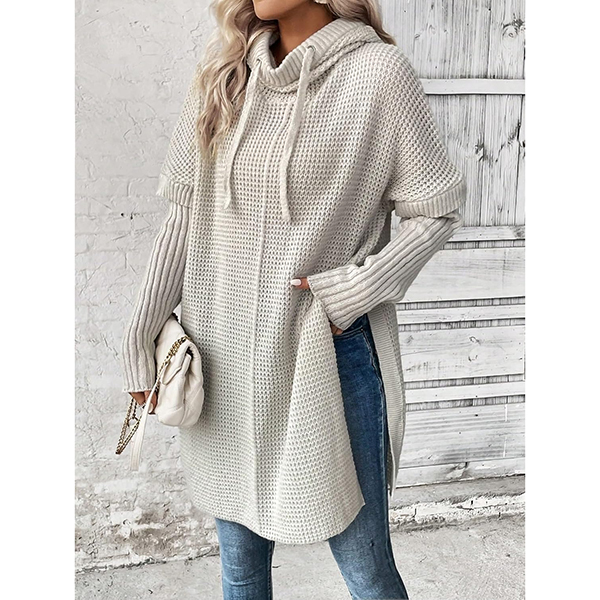 Discover ultimate comfort meets contemporary style with this longline sweater that redefines cozy chic. The relaxed hood with adjustable drawstring adds a sporty, laid-back vibe while providing extra warmth on cooler days. Ribbed knit texture along the long sleeve creates visual depth and a luxurious feel, while the longline silhouette offers versatile styling options. Strategic side slits add movement and prevent the longer length from overwhelming your frame, creating a flattering drape that's both comfortable and stylish. Whether you style it as a dress with tall boots and leggings, or pair it with your favorite jeans for a casual weekend look, this sweater adapts to your lifestyle