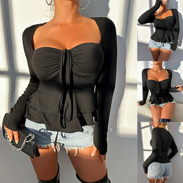 Upgrade your wardrobe with this stylish shirt! The drawstring sweetheart neckline adds a feminine and flattering touch, allowing you to adjust the neckline to your preferred fit. The ruffle hemline adds a playful and chic detail, creating a trendy and romantic look. Pair this shirt with jeans or trousers for a polished and stylish outfit!
