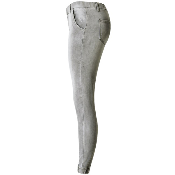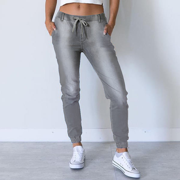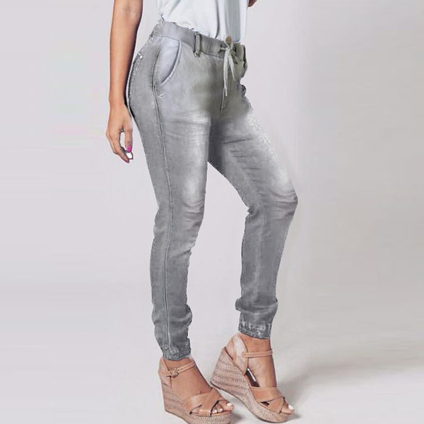 These jeans feature an elastic drawstring waist, an old-washed denim fabric. Pair them with a tucked-in blouse and heels for a chic and casual look.