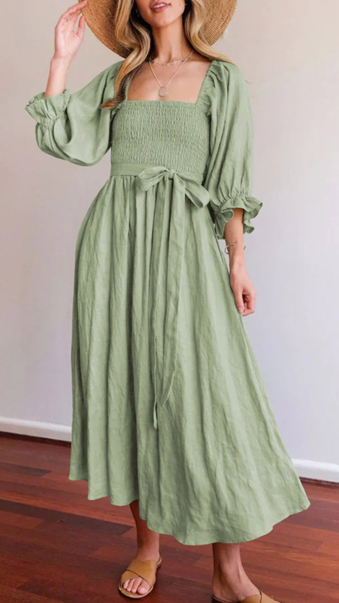 Fashion Elbow Sleeve Smocked Bodice Midi Dress-Versatile Dress with Dual Wear Options