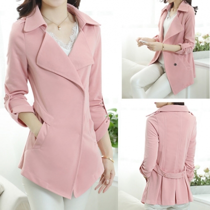 If you wanna pursue fashion,then a windbreaker suit is a necessary for you which makes you look casual but elegant. Pure color, covered button,gather waistline,with two side pockets. Perfect for match pure color tight pants. Take it to show your sweet femininity.