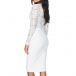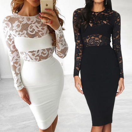 The beautiful dress is decorated with solid color and lace spliced patterns, with round neck and long