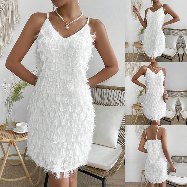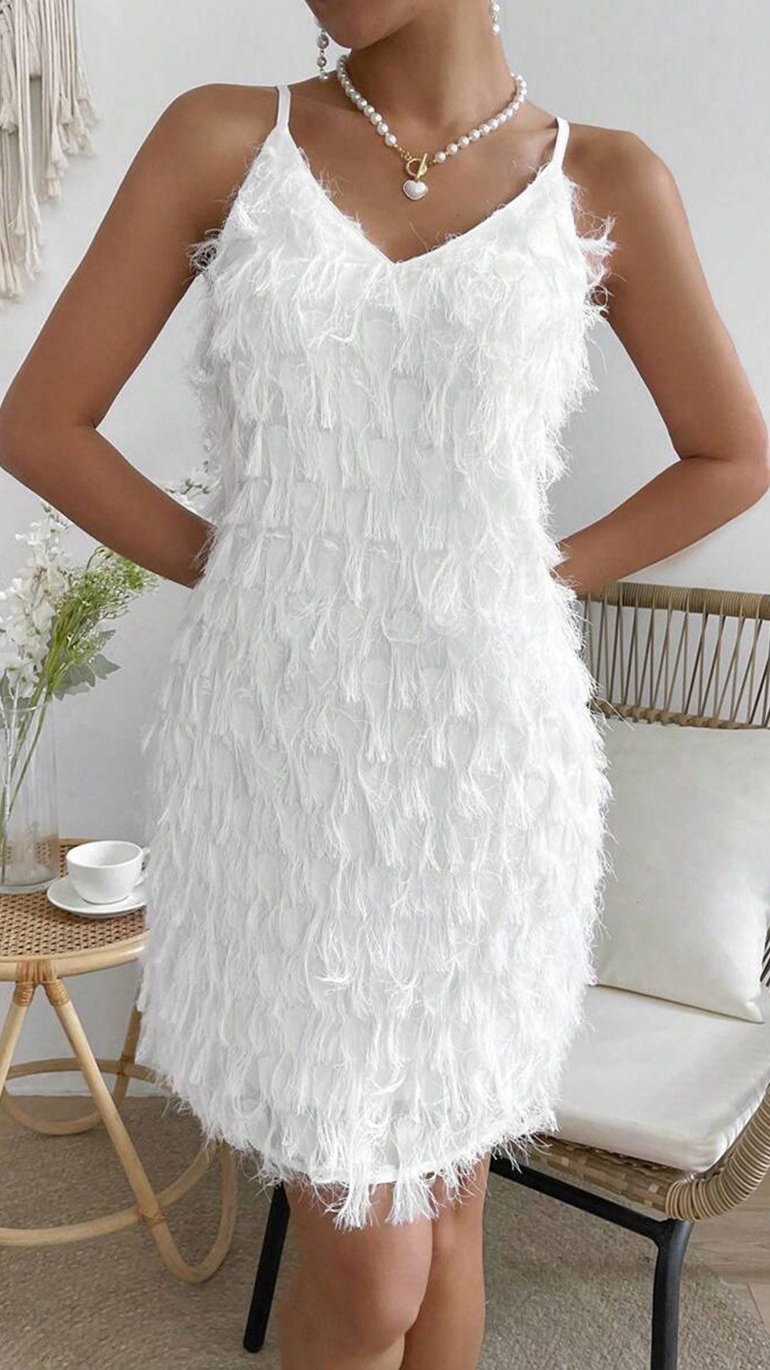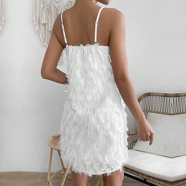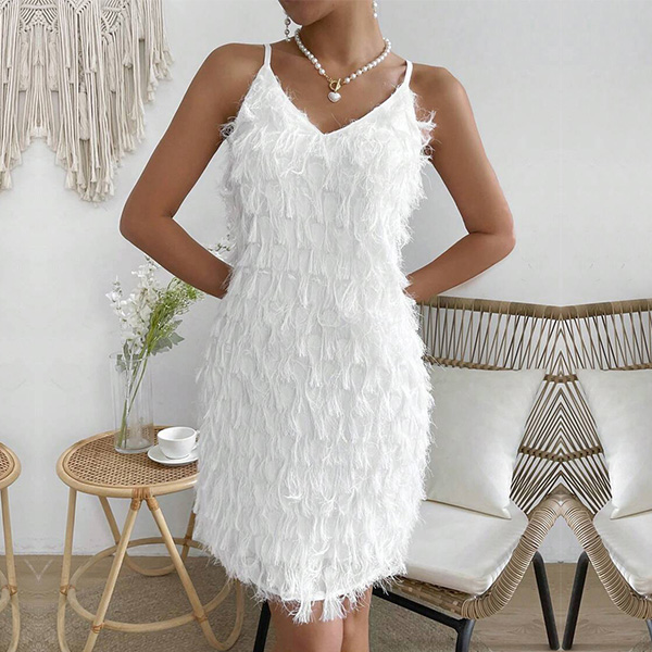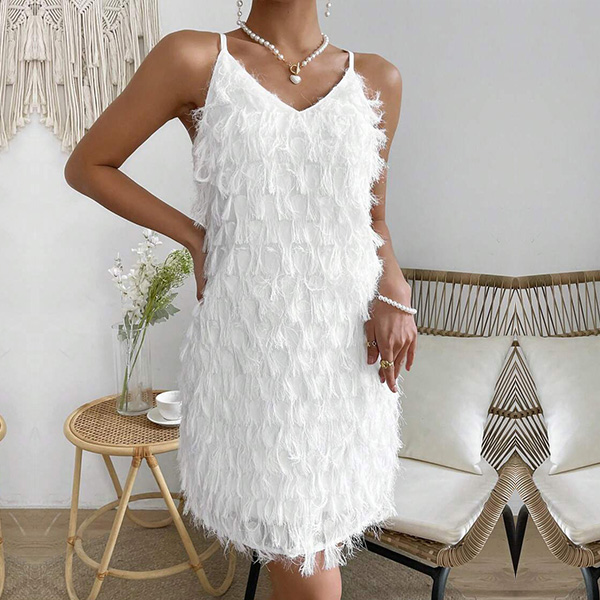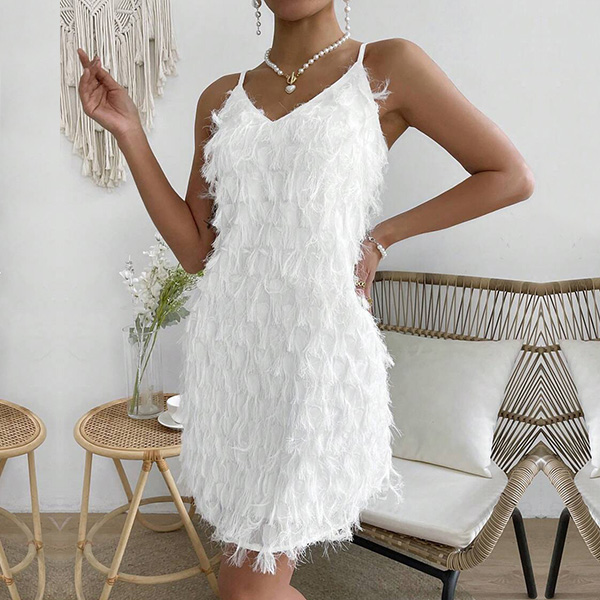 This is a stunning and glamorous party dress that combines an elegant V-neckline, a backless design, and multi-layered tassel detailing for a show-stopping party look. This party dress is perfect for any special occasion where you want to make a memorable entrance.