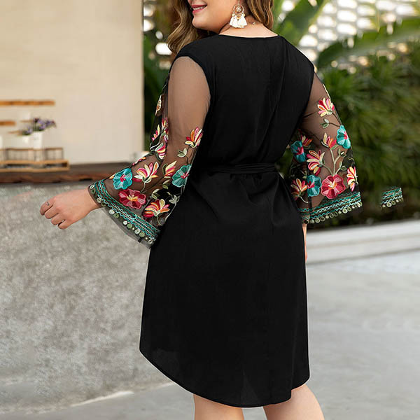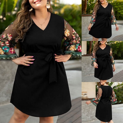 Fashion Embroidered Gauze Spliced Long Sleeve V-neck Plus-size Dress