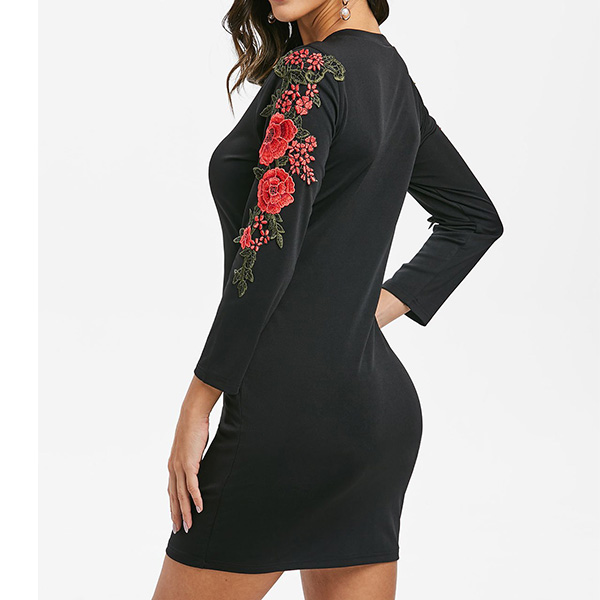 Fashion Embroidered Spliced Long Sleeve Round Neck Slim Fit Dress
