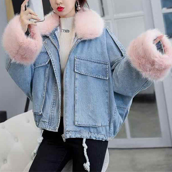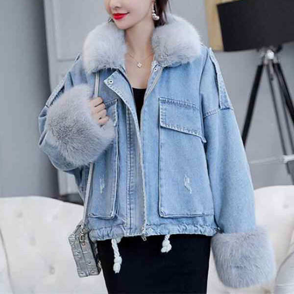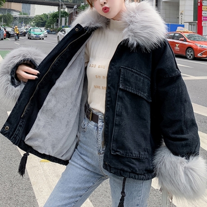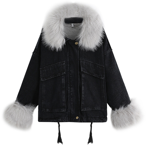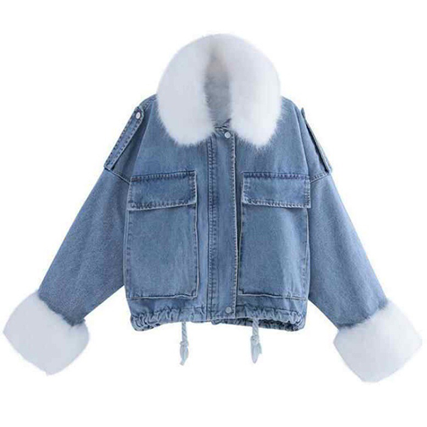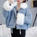Fashion Faux Fur Collar Long Sleeve Plush Lining Denim Coat