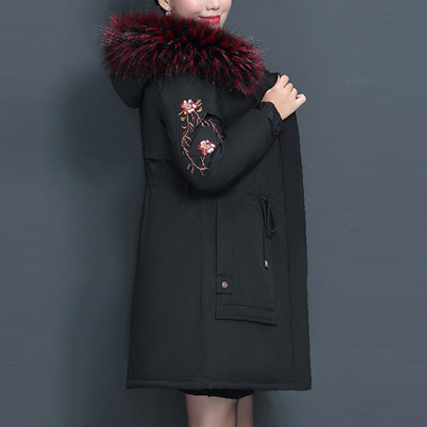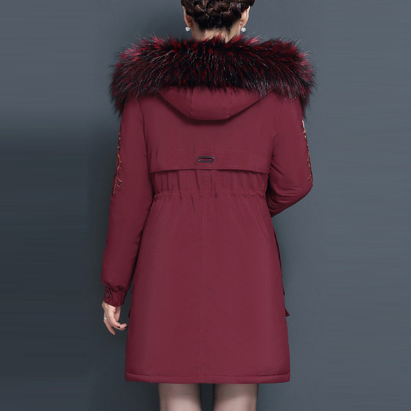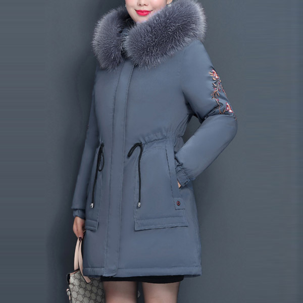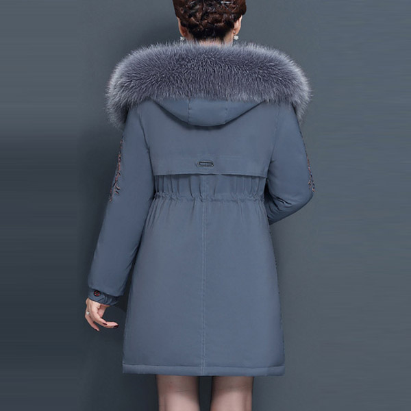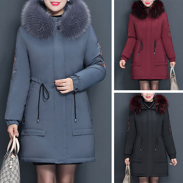 For the coming chilly winter,you can prepare for a surprise with this padded coat for your mother. The faux fur spliced hooded silhouette and soft fabric can ensure a warm and comfortable day,while the embroidered details will make it look more delicate. The clean silhouette and drawstring waist design can help showcase the slender figure. Express your love to your mother via this coat.