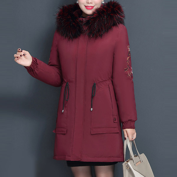 Fashion Faux Fur Spliced Hooded Drawstring Waist Embroidered Padded Coat