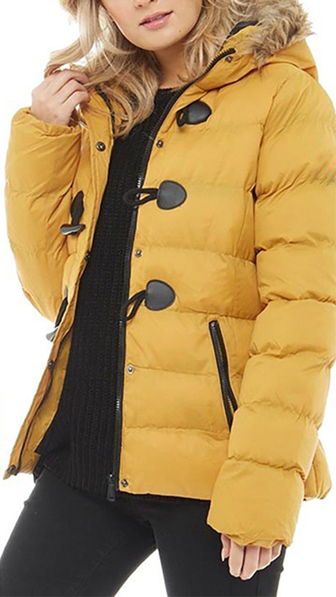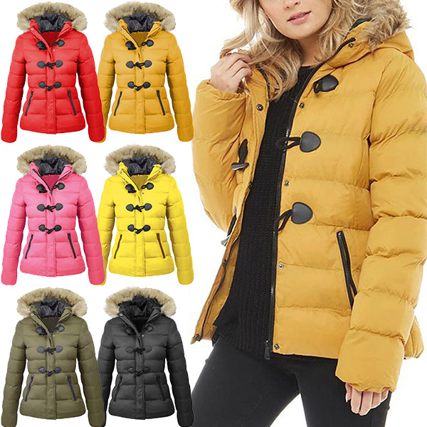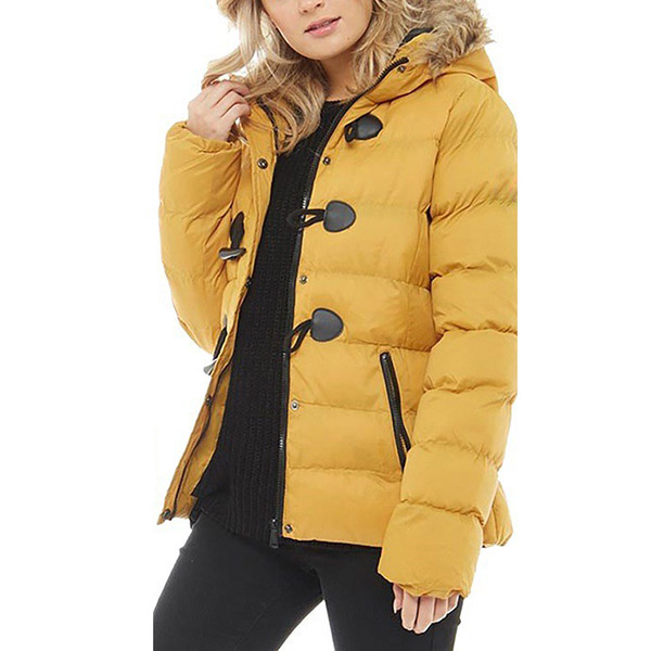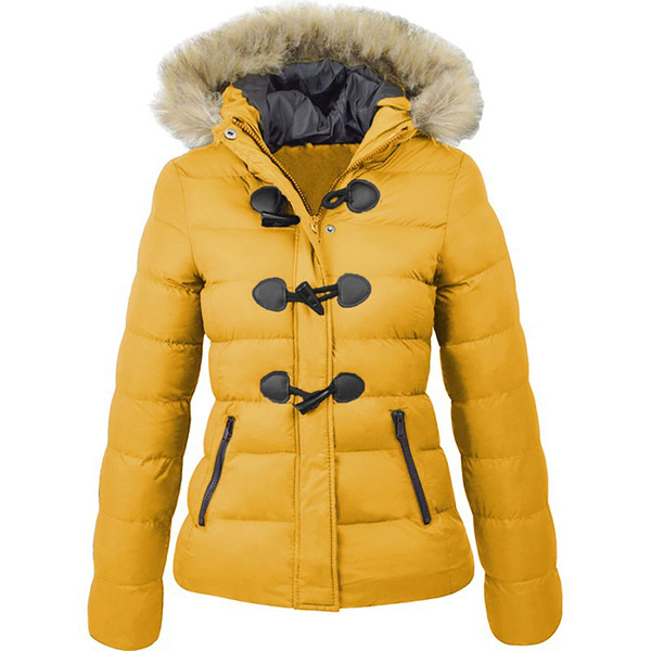 When the days get cold,this padded coat would be your wardrobe staple. Solid color style,the faux fur spliced hooded and soft fabric can ensure you a warm and comfortable day. Moreover,the horn button design will lend you some retro vibes. And the zipper pockets design can keep your belongings safety. Your perfect partner for your in these cold days.