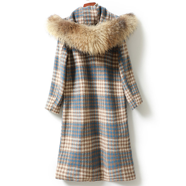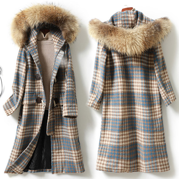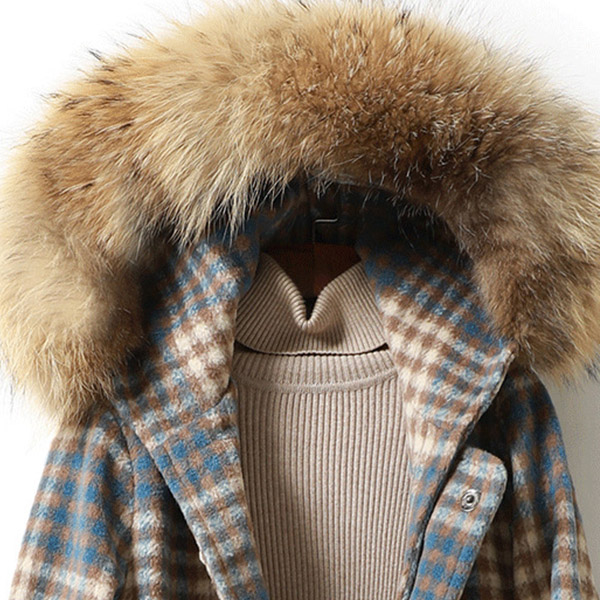 Fashion Faux Fur Spliced Hooded Long Sleeve Plaid Duffle Coat
