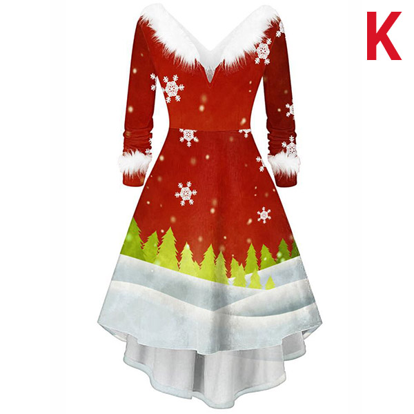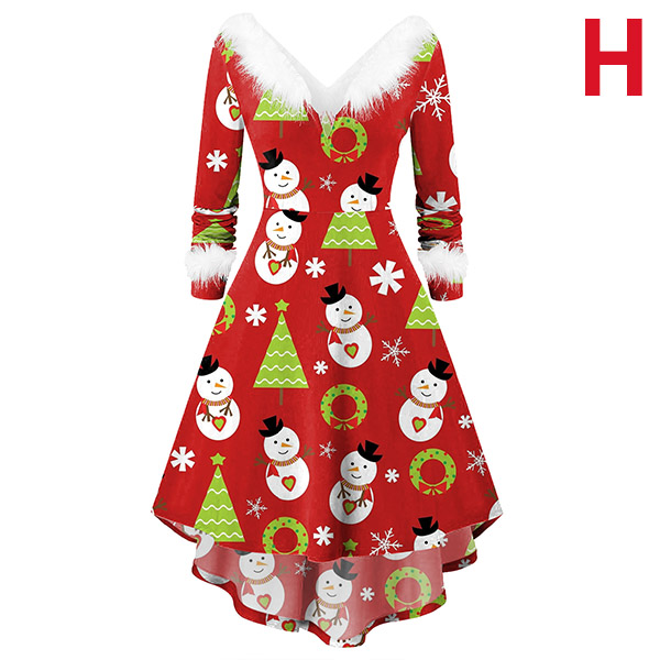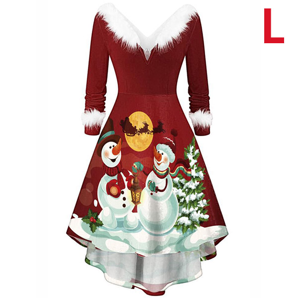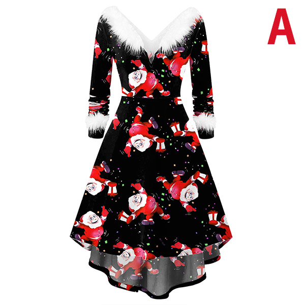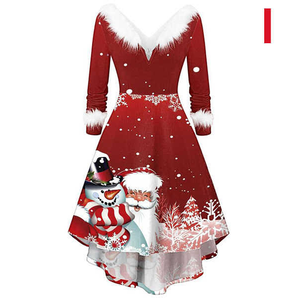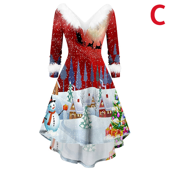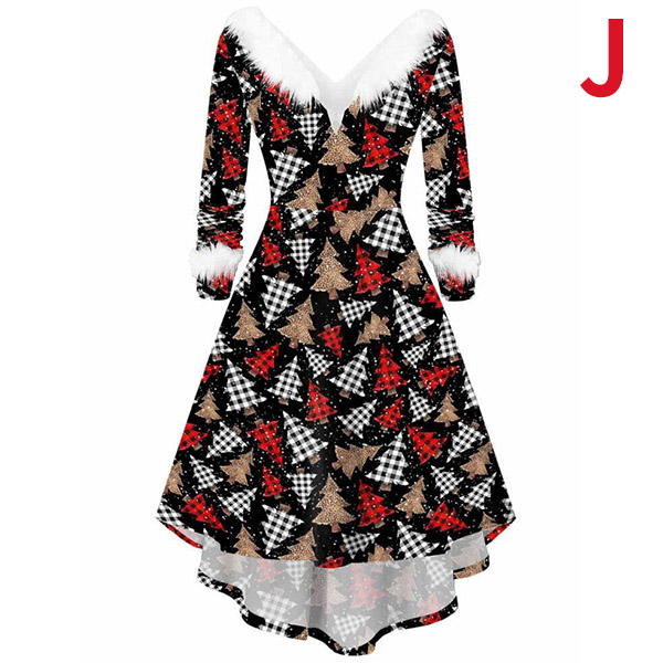 Fashion Faux Fur Spliced Long Sleeve V-neck High-low Hem Christmas Printed Dress