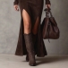 Fashion Faux Suede Maxi Dress - Square Neck Long Sleeve with Belt & High Slit