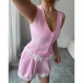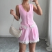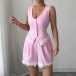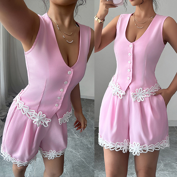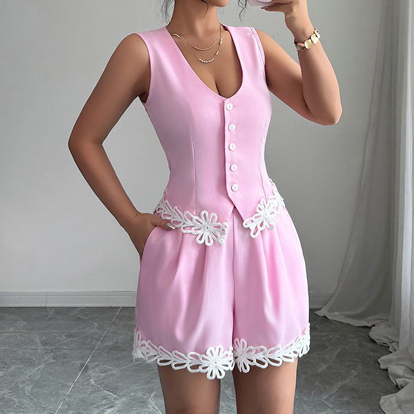 Embrace playful femininity in this sweet two-piece set that's perfect for warm, carefree days. Pretty pink hues create an instantly cheerful, youthful vibe, while delicate floral crochet splicing adds artisanal texture and romantic bohemian charm. The vest offers breezy, relaxed styling that keeps you cool, paired with matching shorts for a coordinated look that's effortlessly put-together. Perfect for summer wear.