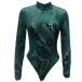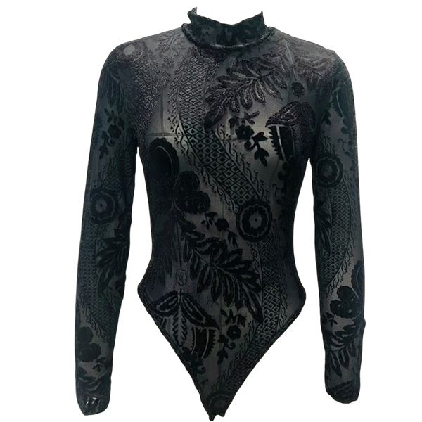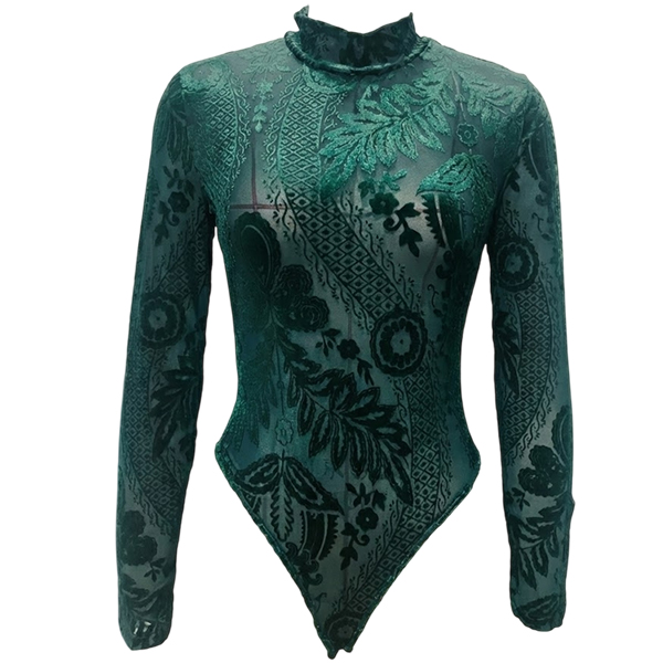 Fashion Floral Embroidered Mock Neck Long Sleeve Semi-through Bodysuit