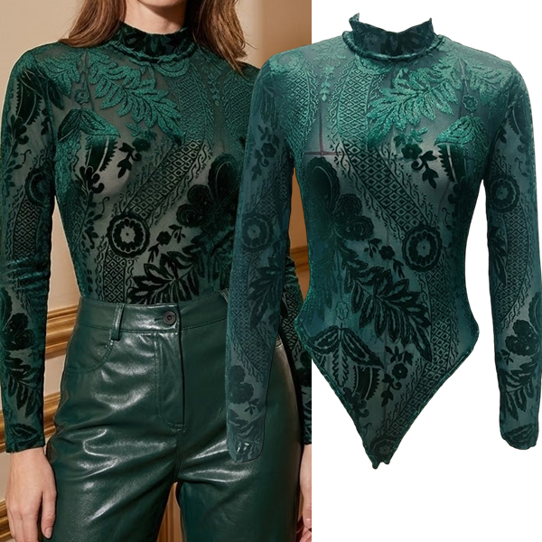 This romantic bodysuit features elegant mock neck styling with intricate floral embroidery and alluring semi-sheer construction for contemporary feminine sophistication. Pair with high-waisted bottoms and delicate accessories for romantic sophisticated appeal.