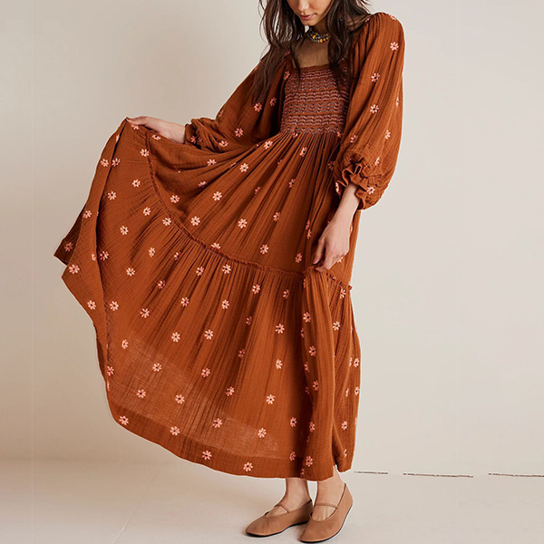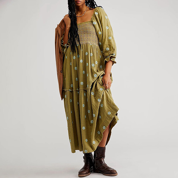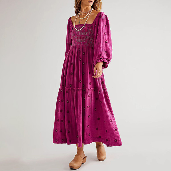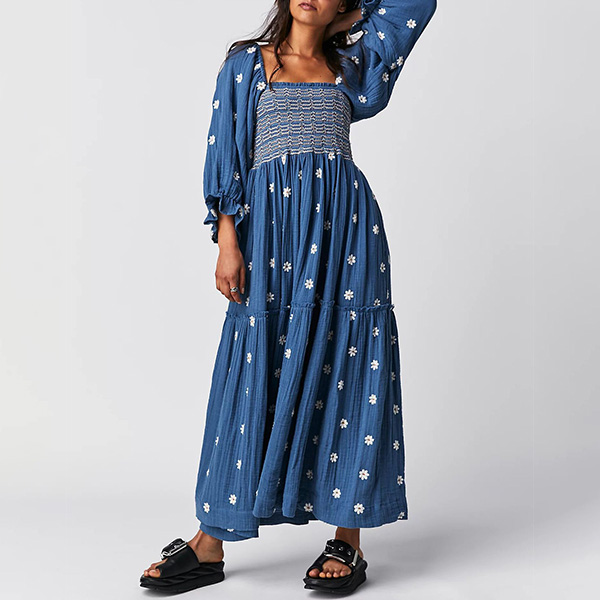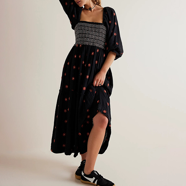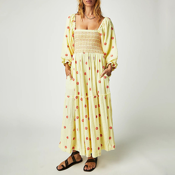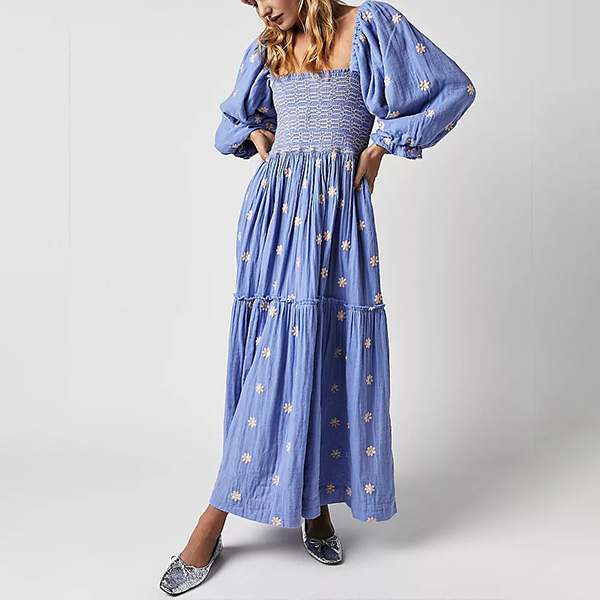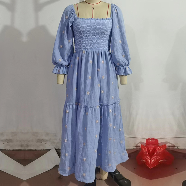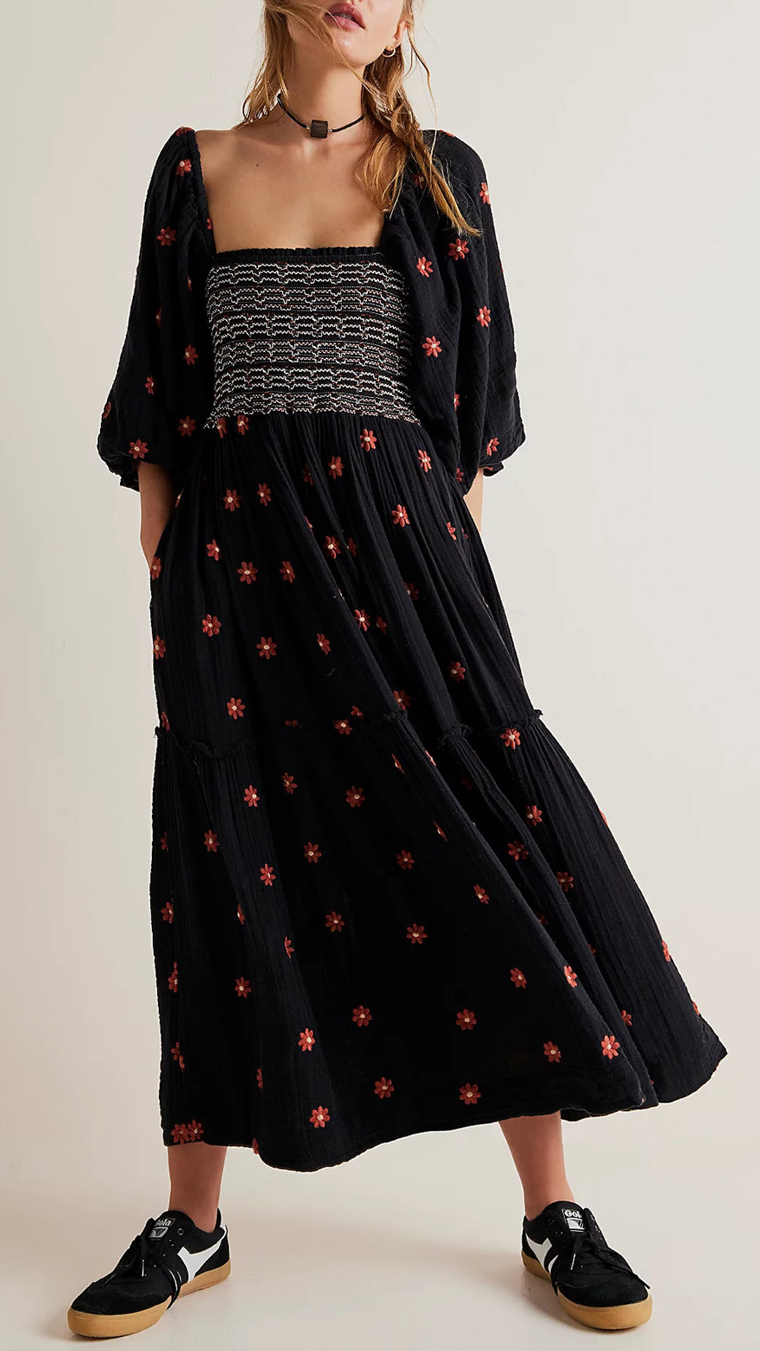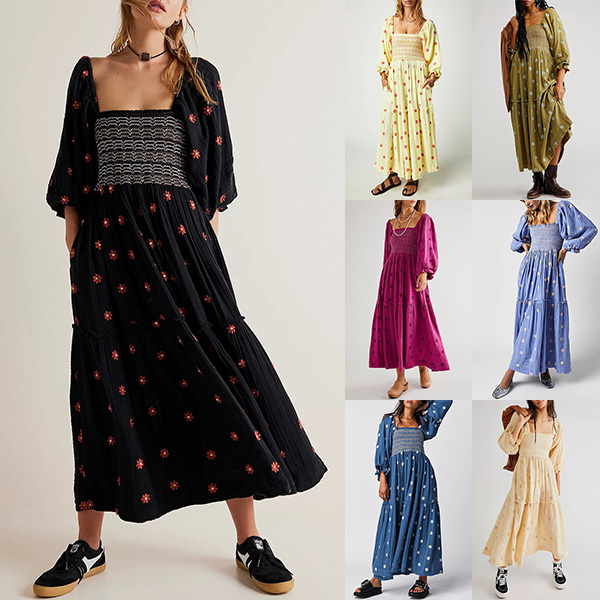 This dress combines trendy elements with delicate floral embroidery for a truly captivating look. Crafted with attention to detail, this midi dress features a square neckline, smocked bodice, elbow sleeve and maxi length, that adds a touch of elegance and sophistication. Wanna have one?