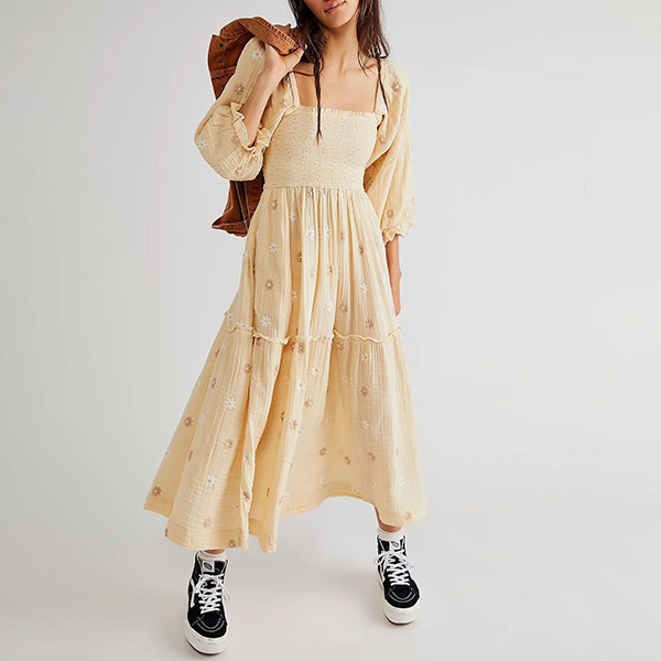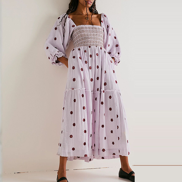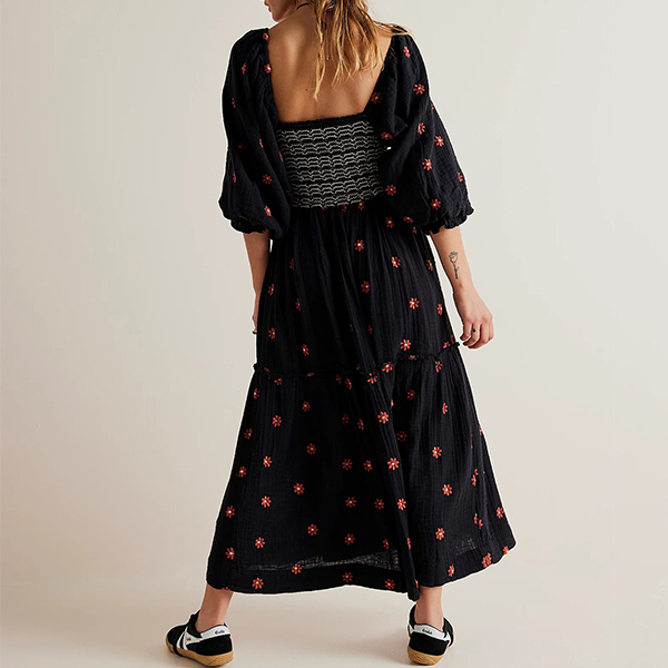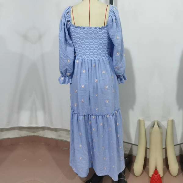 Fashion Floral Embroidery Square Neck Smocked Elbow Sleeve Midi Dress