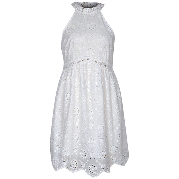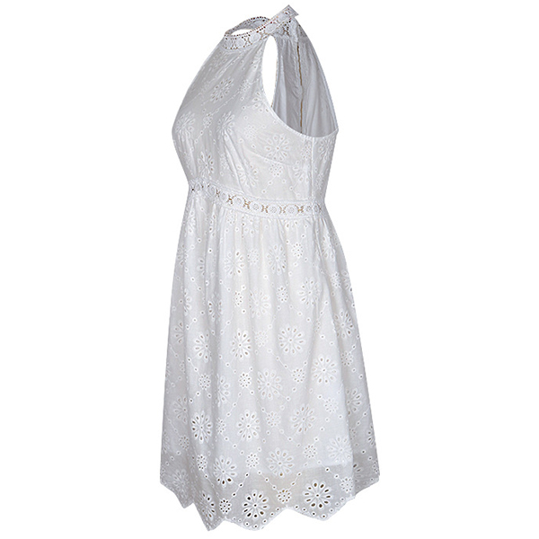 This mini white dress features floral hollowout, halter neck, sleeveless silhouette, and a flirty mini length for a fashionable and playful look. Wanna have one?
