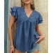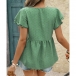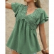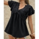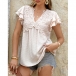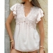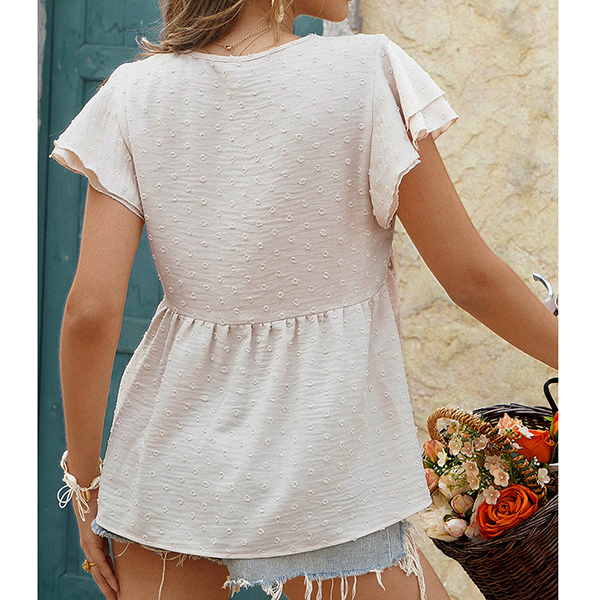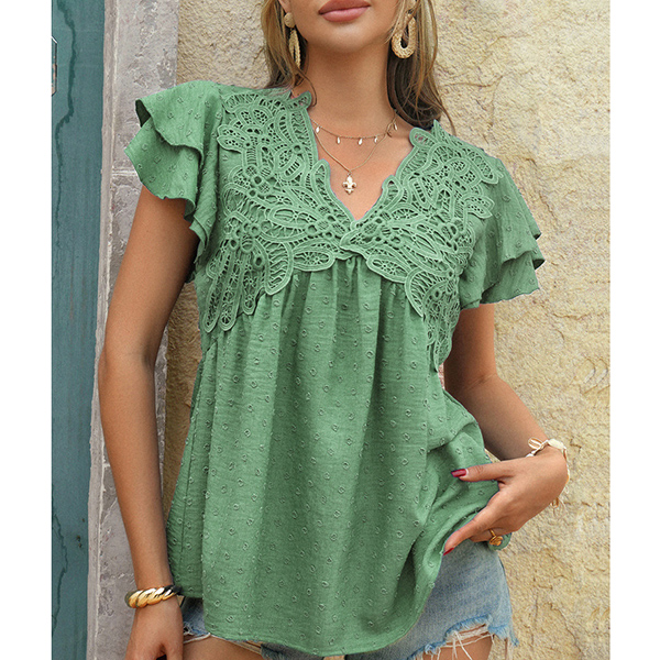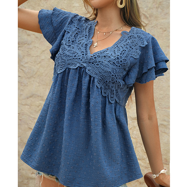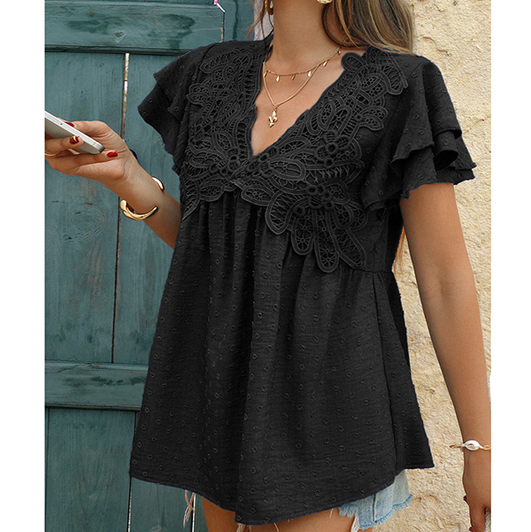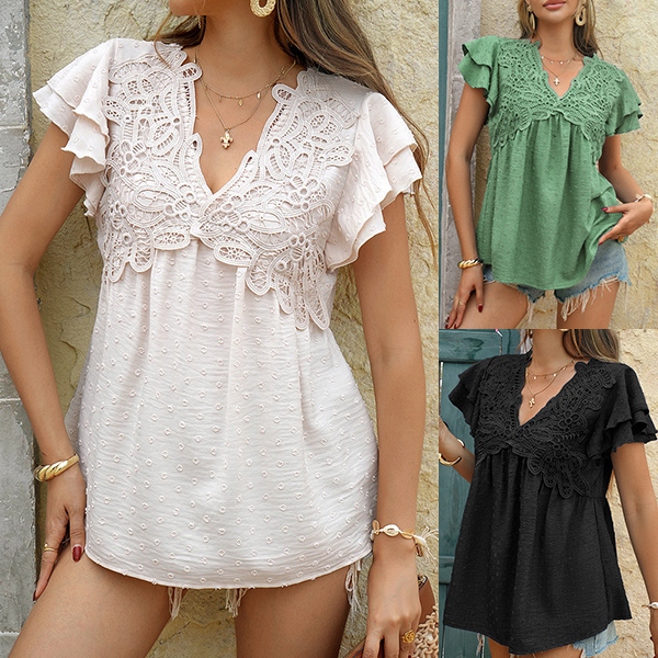 How about this shirt? The floral lace spliced design offers a delicate and intricate look, creating a soft and ethereal aesthetic that is perfect for a variety of occasions. The V-neckline adds a touch of allure, while the ruffle detailing along the short sleeve and Swiss-dot fabric provide a whimsical and stylish flair. Wanna have a try?