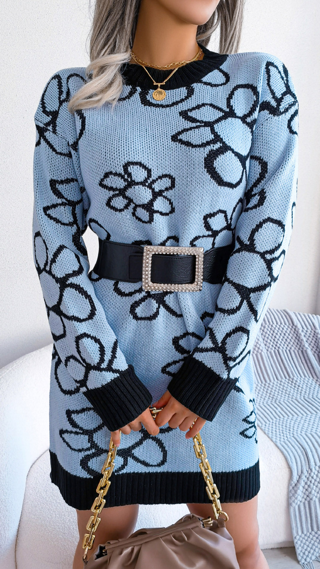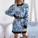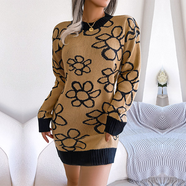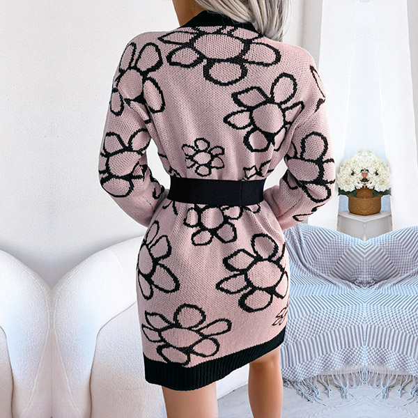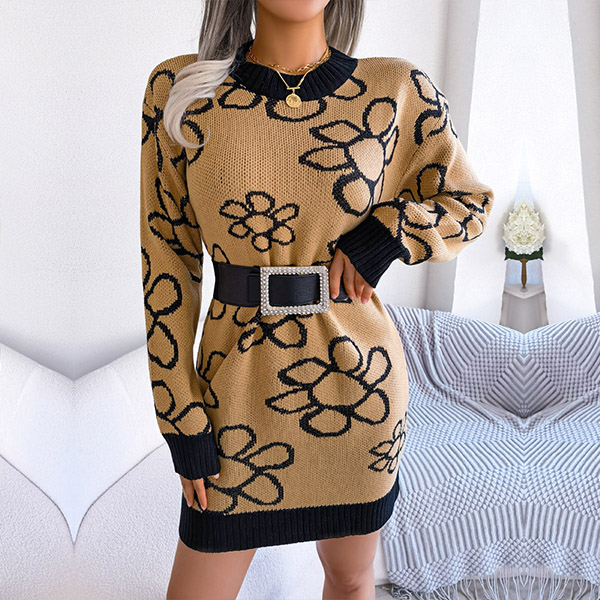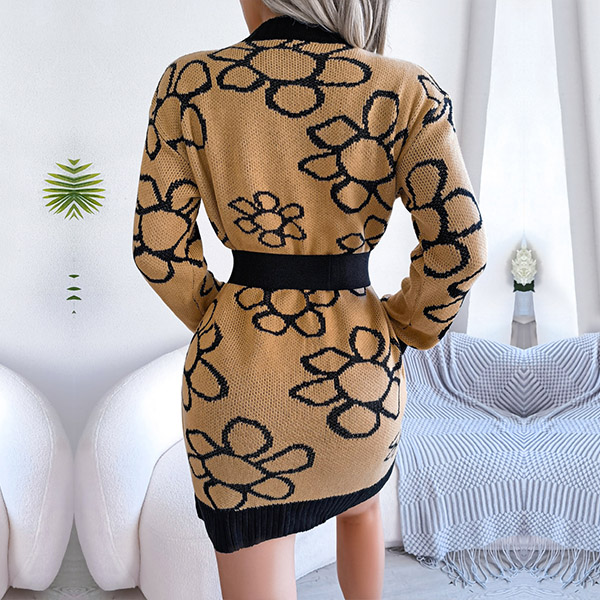Fashion Floral Pattern Knitted Dress (without Belt)