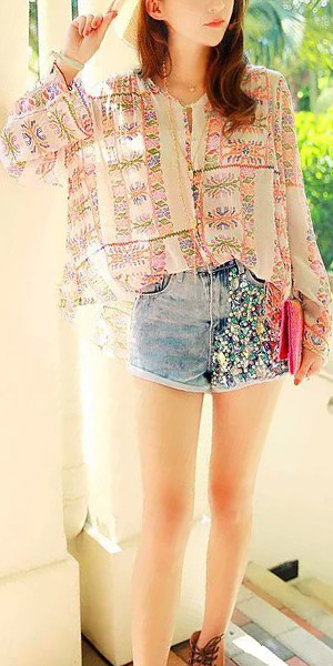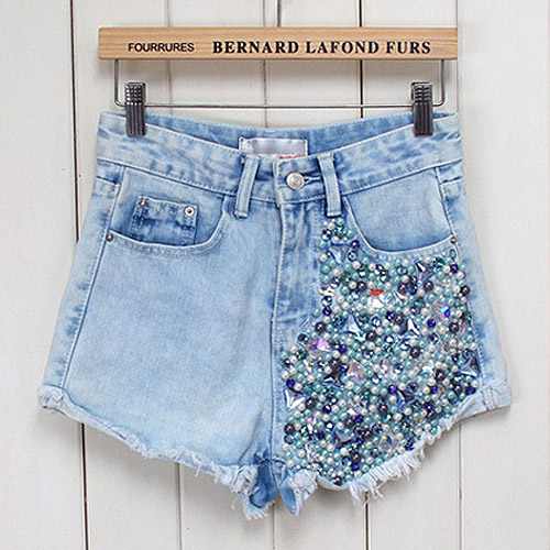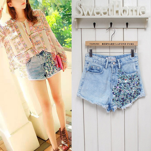 sleeve and loose design. Denim shorts features sparkly beads design. You