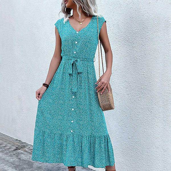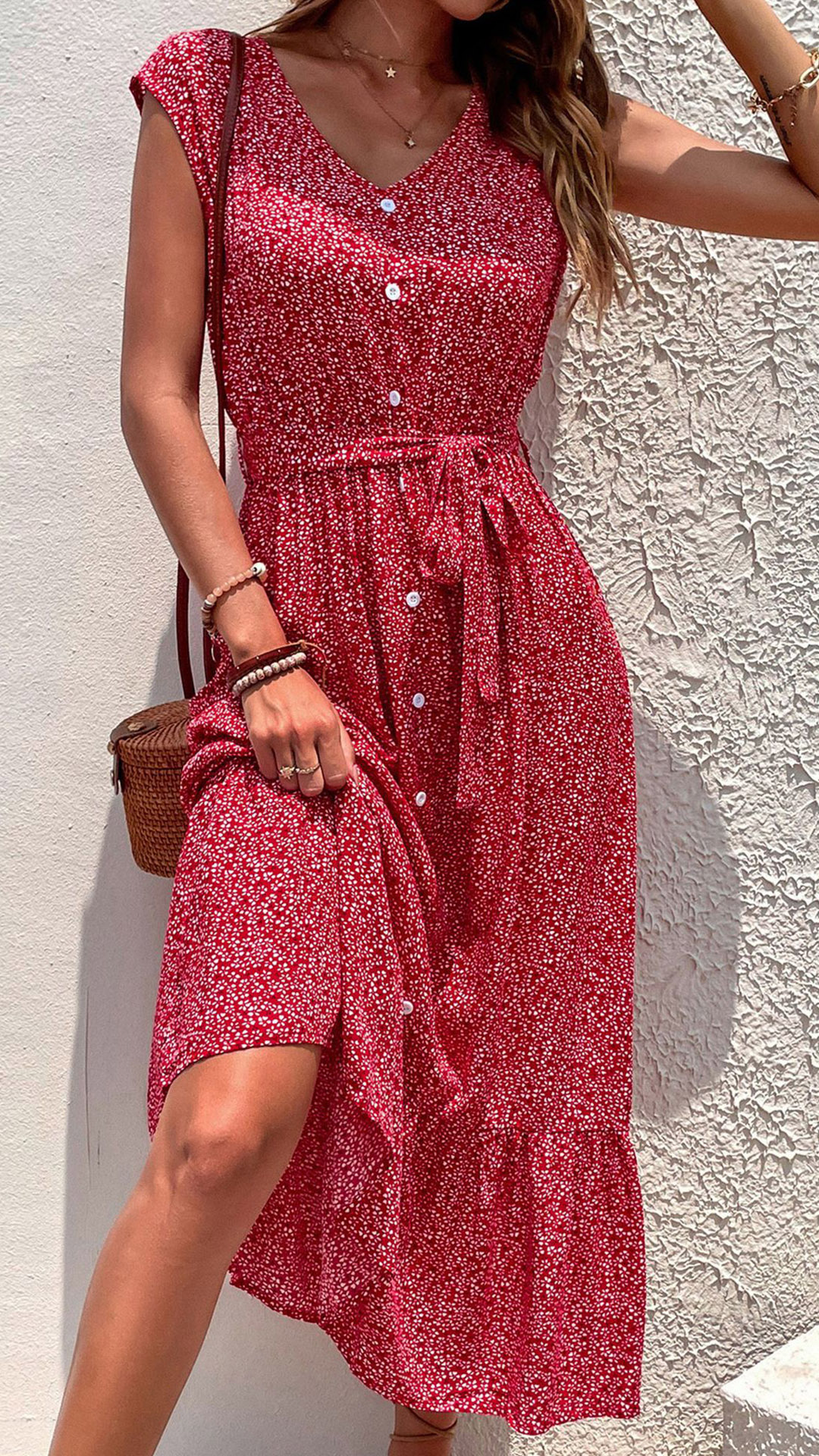 Fashion Floral Printed Buttoned V-neck Cap Sleeve Self-tie Midi Dress