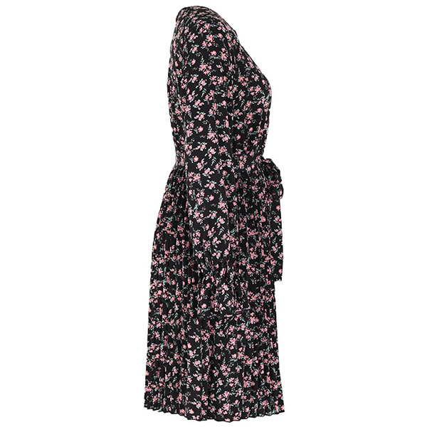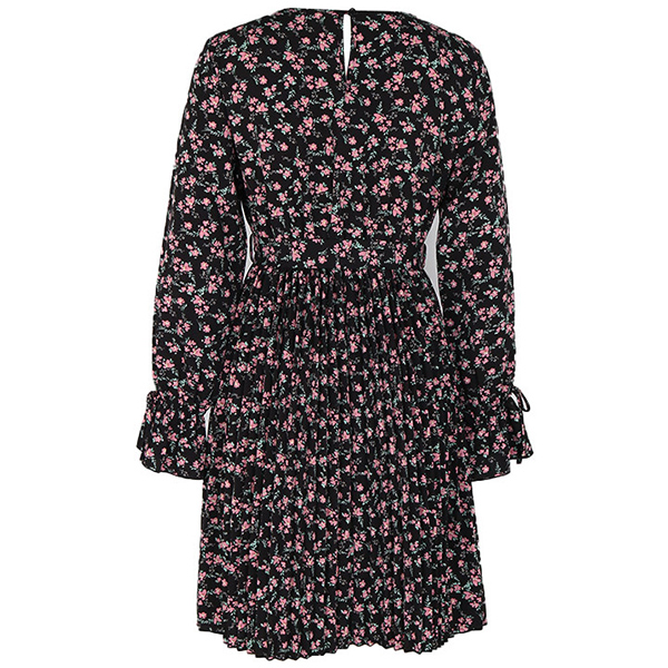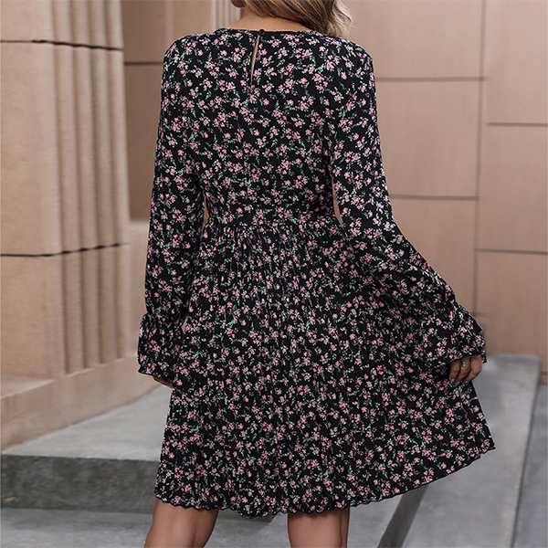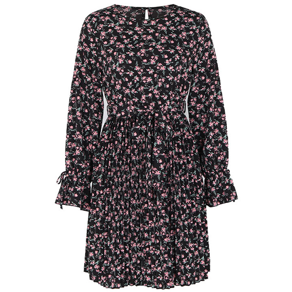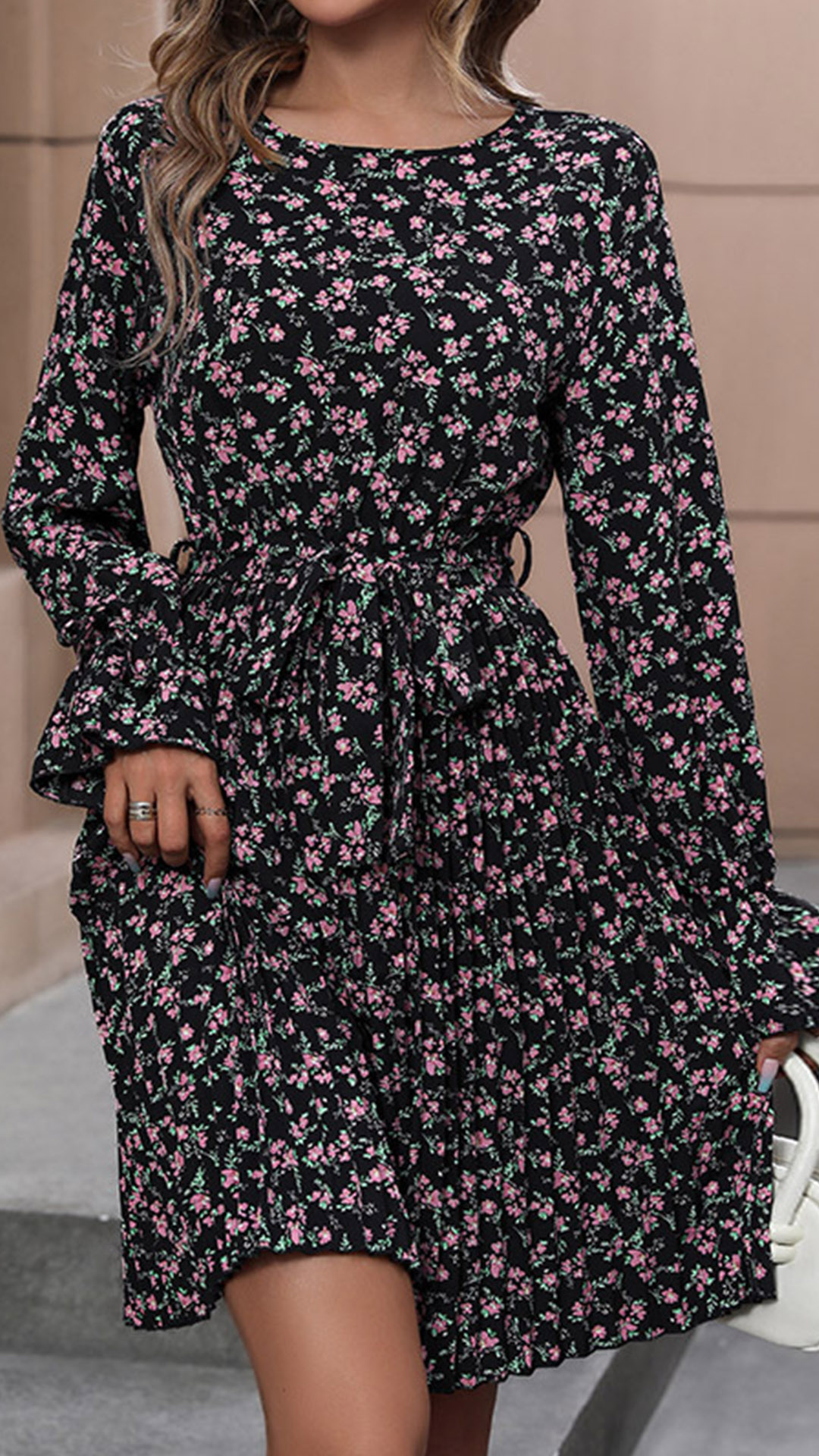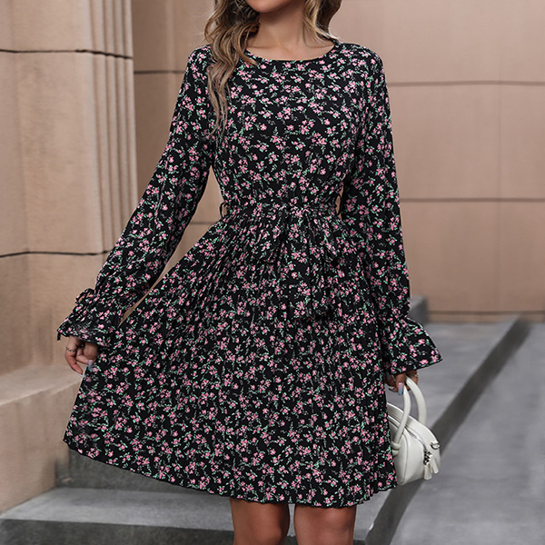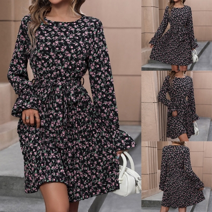 Fashion Floral Printed Crew Neck Long Sleeve Self-tie Waist Mini Dress
