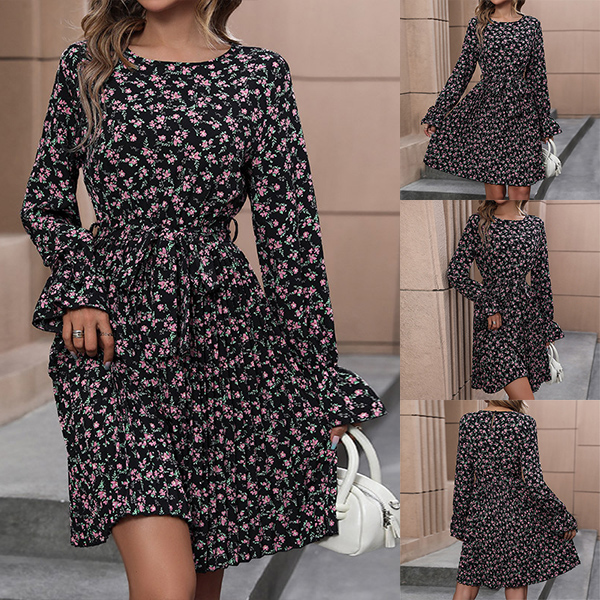 This fashionable mini dress features a floral print, a crew neckline, long sleeves, and a self-tie waist, creating a stylish and feminine look. Pair it with sandals or ankle boots for a casual look.
