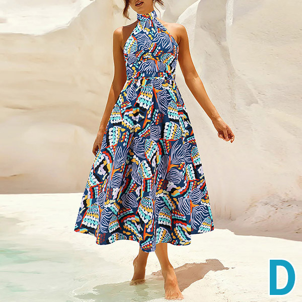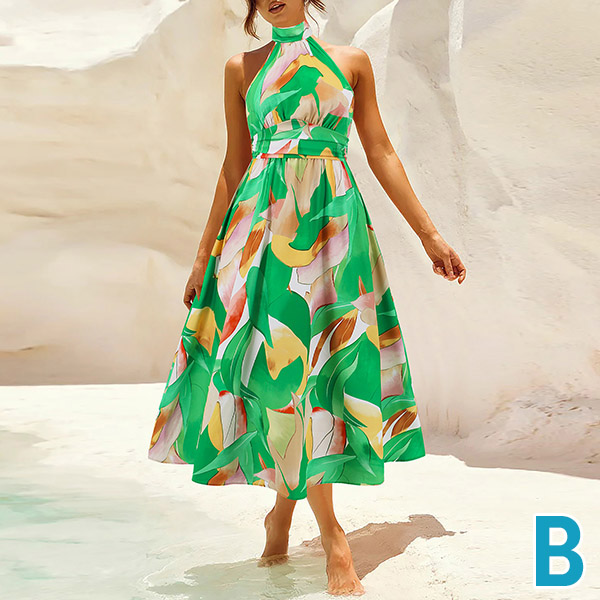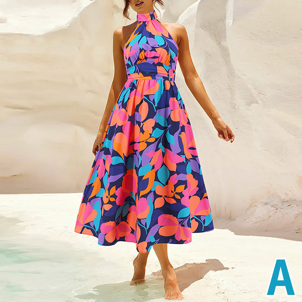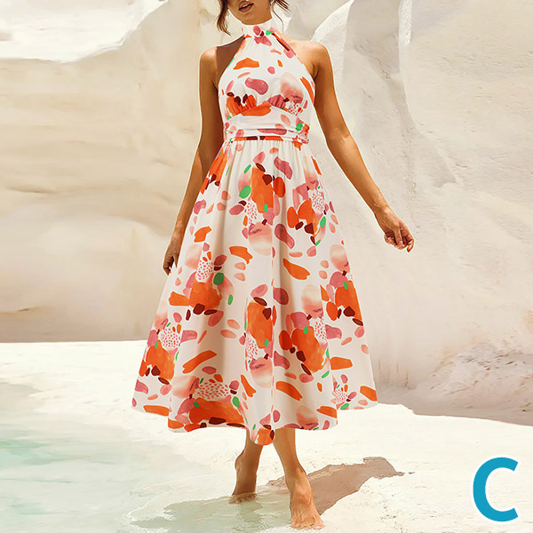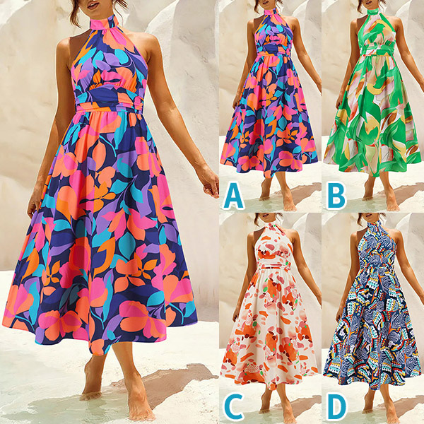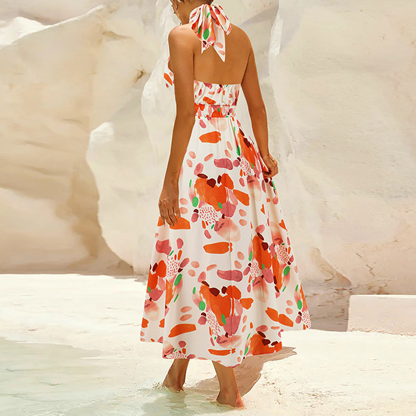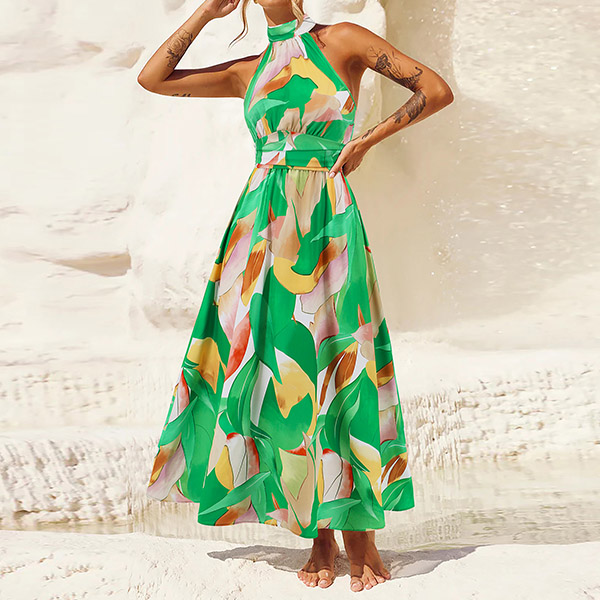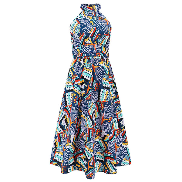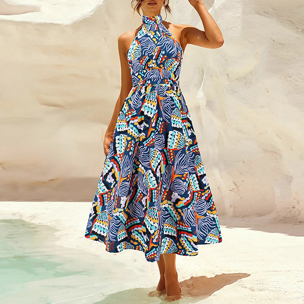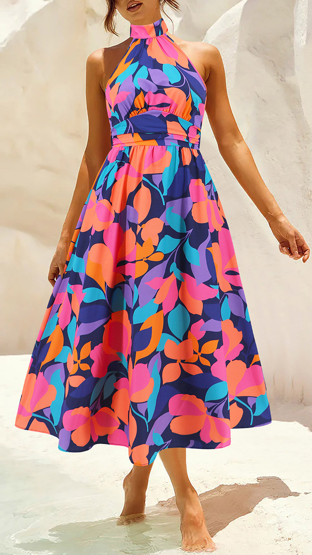 Fashion Floral Printed Halterneck Sleeveless High-rise Midi Dress