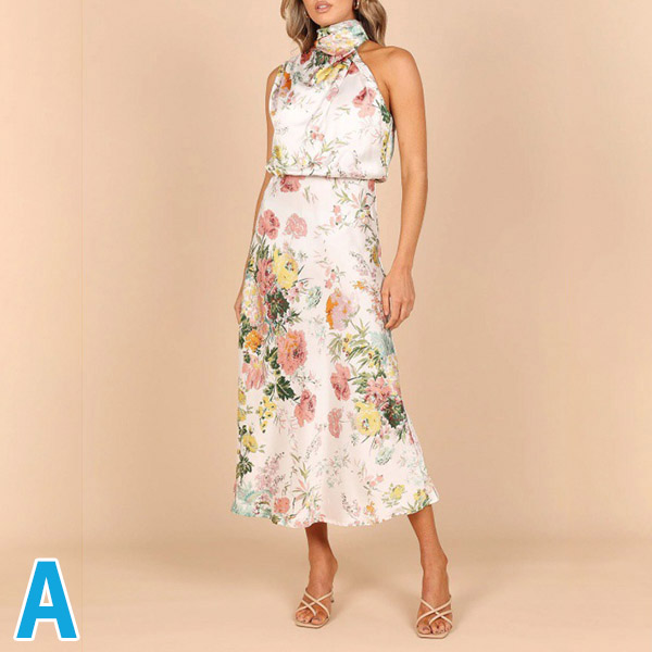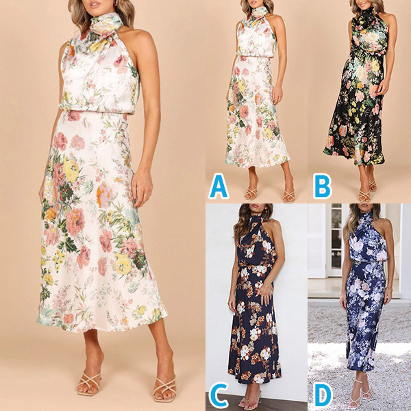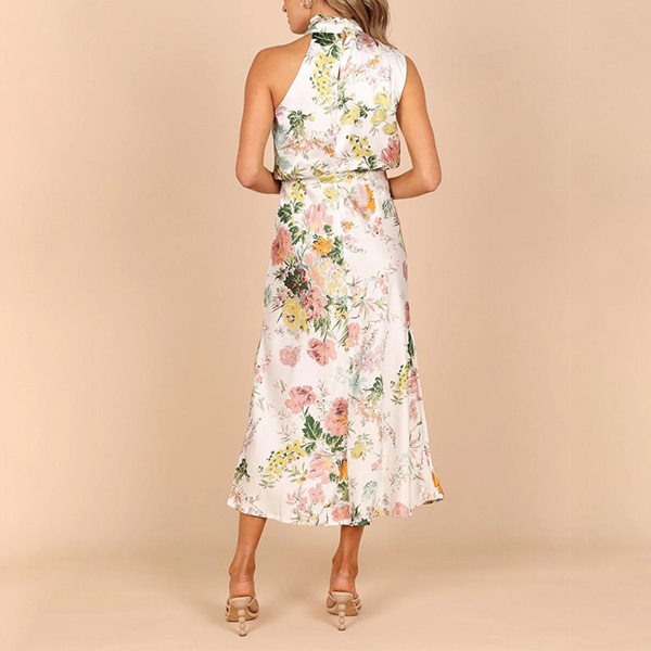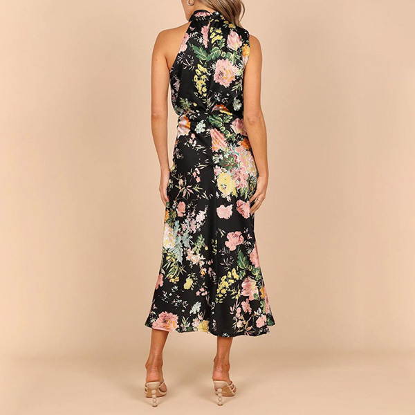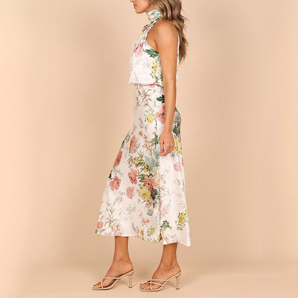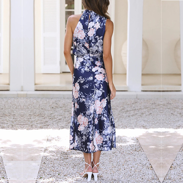 Fashion Floral Printed Halterneck Sleeveless Midi Dress