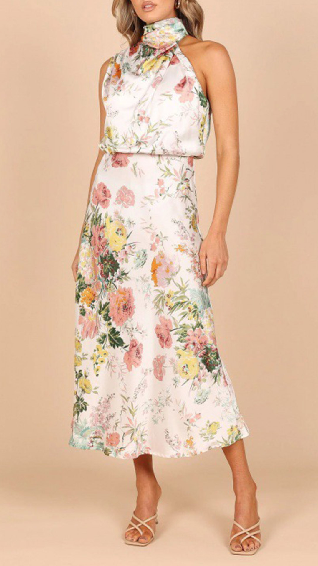 This is a beautiful floral printed midi dress with a halterneck and sleeveless design. The dress features a gorgeous floral pattern that adds a touch of elegance and romance to the overall look. The halterneck design and midi length create a playful and feminine feel to the dress, and it is perfect for any occasion where you want to look both stylish and comfortable.