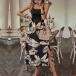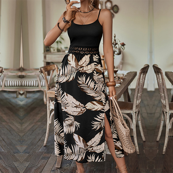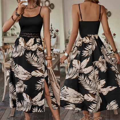 Fashion Floral Printed Lace Spliced Slit Slip Dress