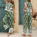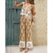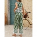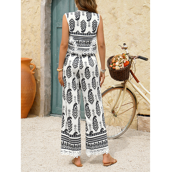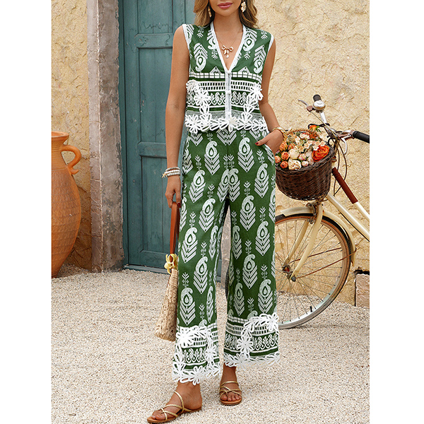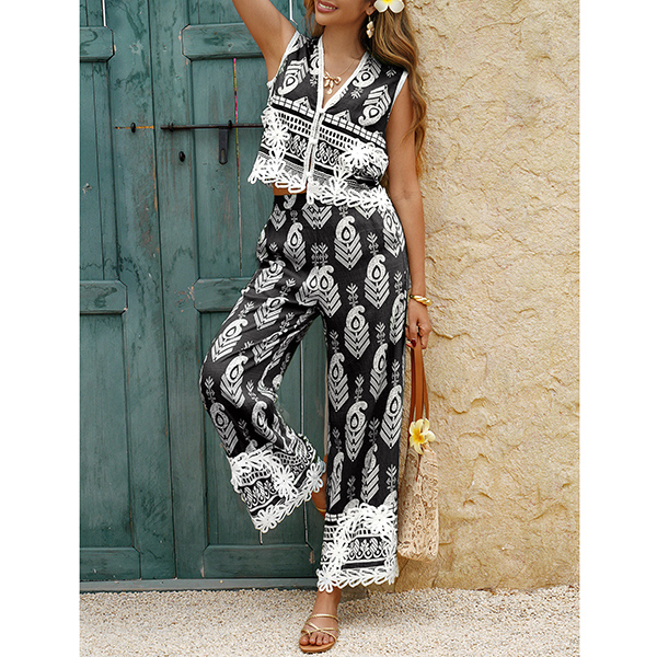 Fashion Floral Printed Lace Spliced Two-piece Set Consist of Sleeveless Vest and Straight-cut Pants