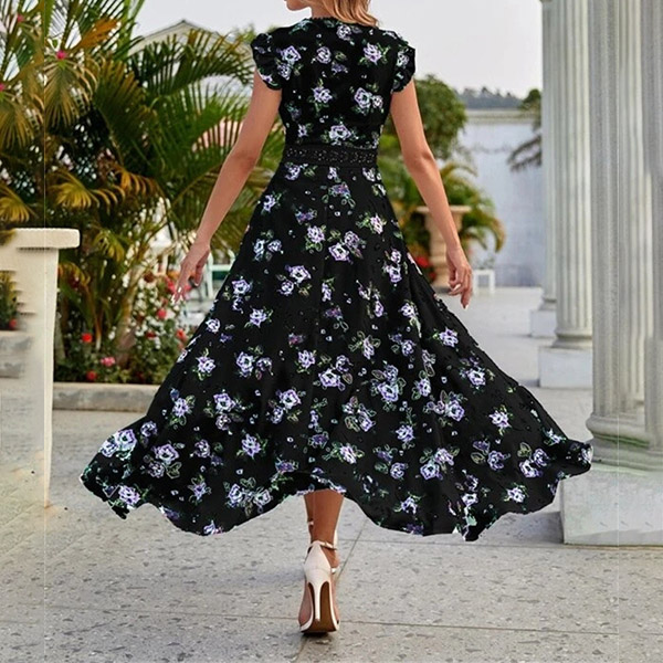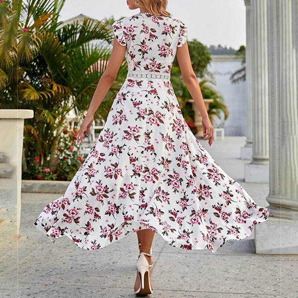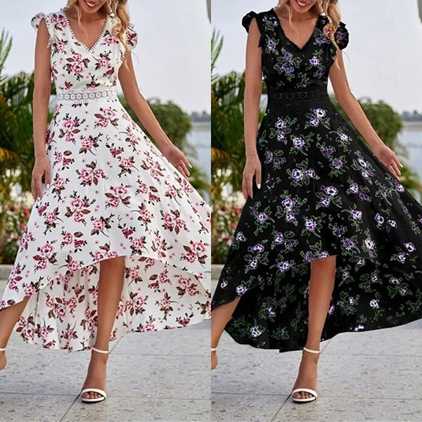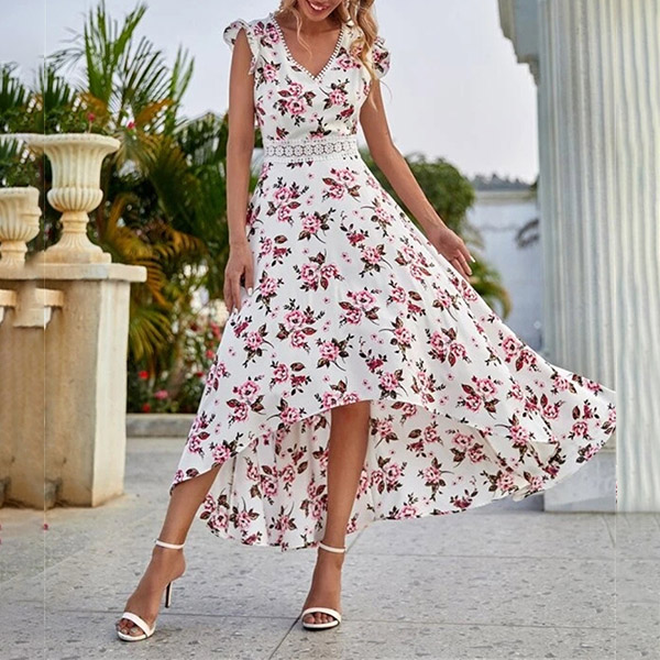 This dress is perfect for a summer day! The floral print is pretty and feminine, and the lace spliced v-neck and lace spliced along the waistline adds a touch of elegance. The high-low hemline is flattering and fun, and the dress is sure to make you feel beautiful and confident.