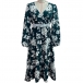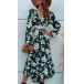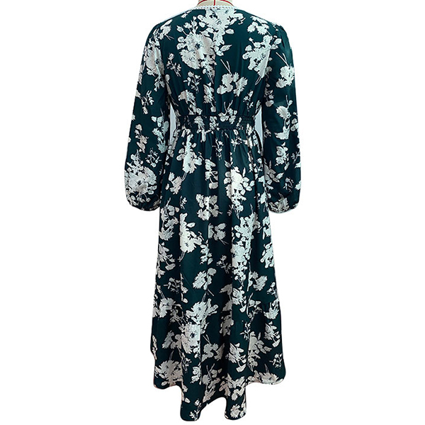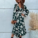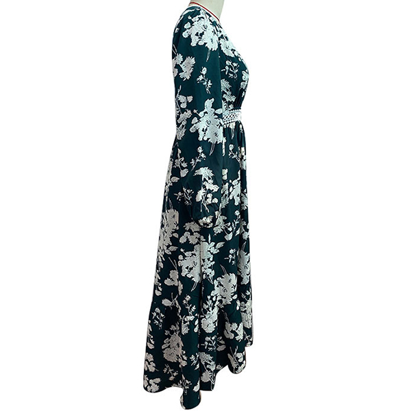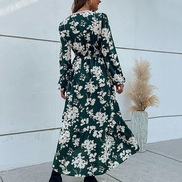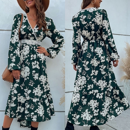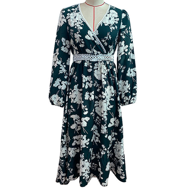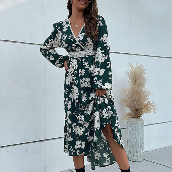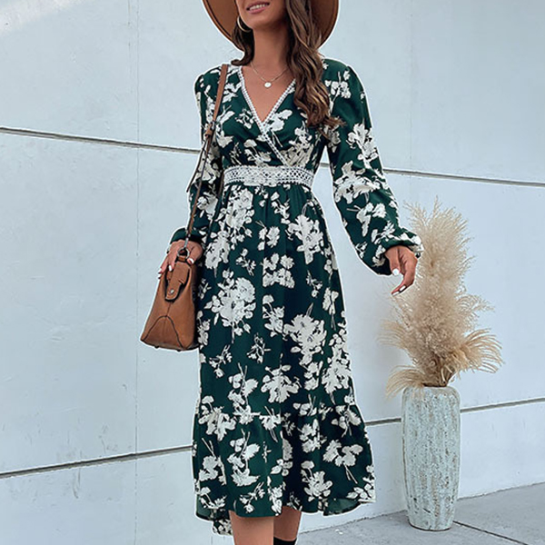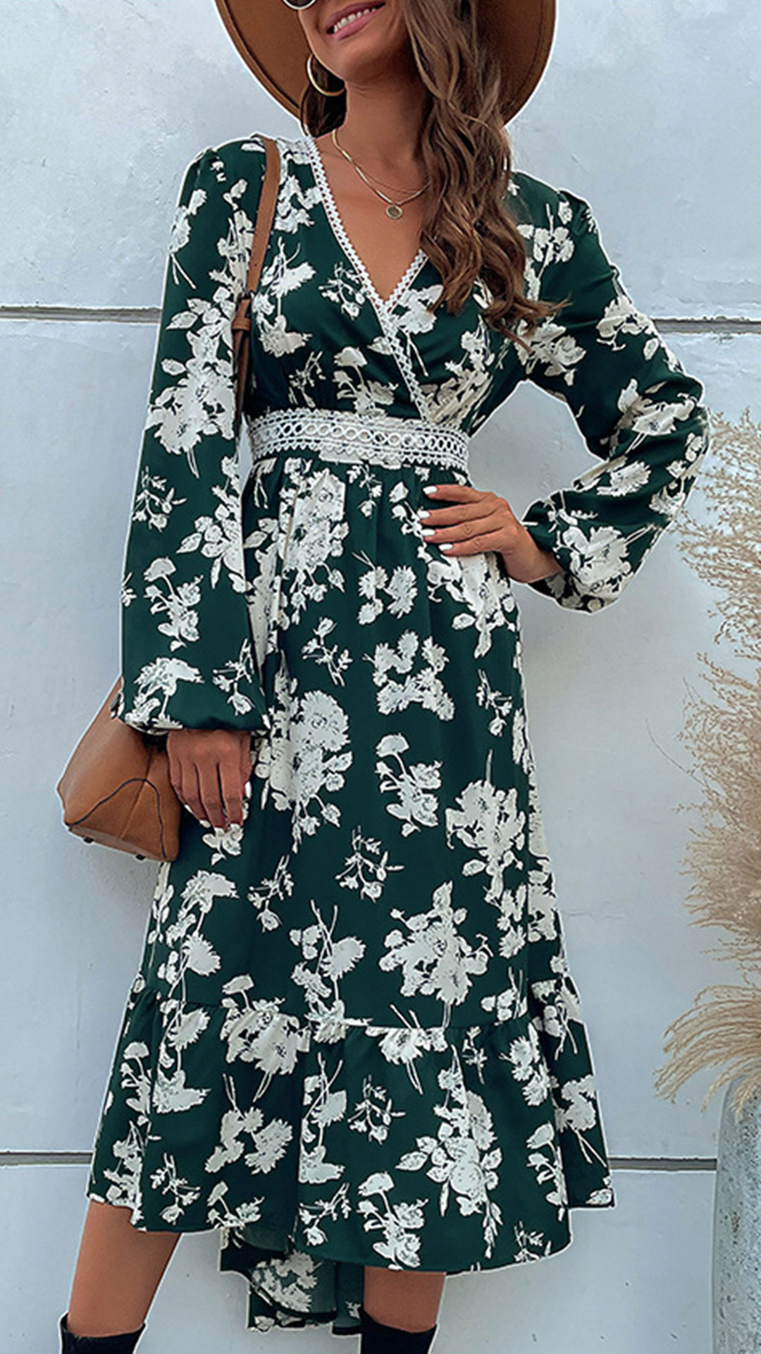 Fashion Floral Printed Lace Spliced V-neck Long Sleeve Midi Dress
