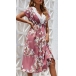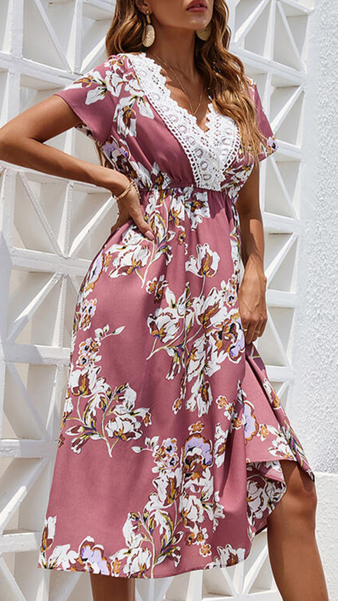 Fashion dress featuring overall floral printed, a sexy lace spliced V-neck, short sleeve, high waist and midi length.