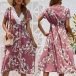 Fashion Floral Printed Lace Spliced V-neck Short Sleeve Dress